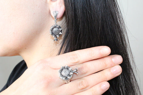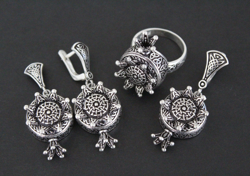 Discover the beauty of Armenian culture with this high-quality jewelry set from Armenian Spirit's Etsy store. Made with Sterling Silver 925, the set includes a stunning pomegranate pendant, dome ring, and dangle earrings adorned with traditional black ornaments. Show your love for your heritage and add a touch of symbolism to any outfit. Looking for the perfect gift for your loved one? Look no further than our hypoallergenic jewelry, suitable for sensitive skin. With worldwide free shipping, our top-rated Etsy store offers affordable prices and reliable service. Trust us for your online jewelry shopping needs.