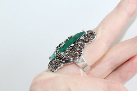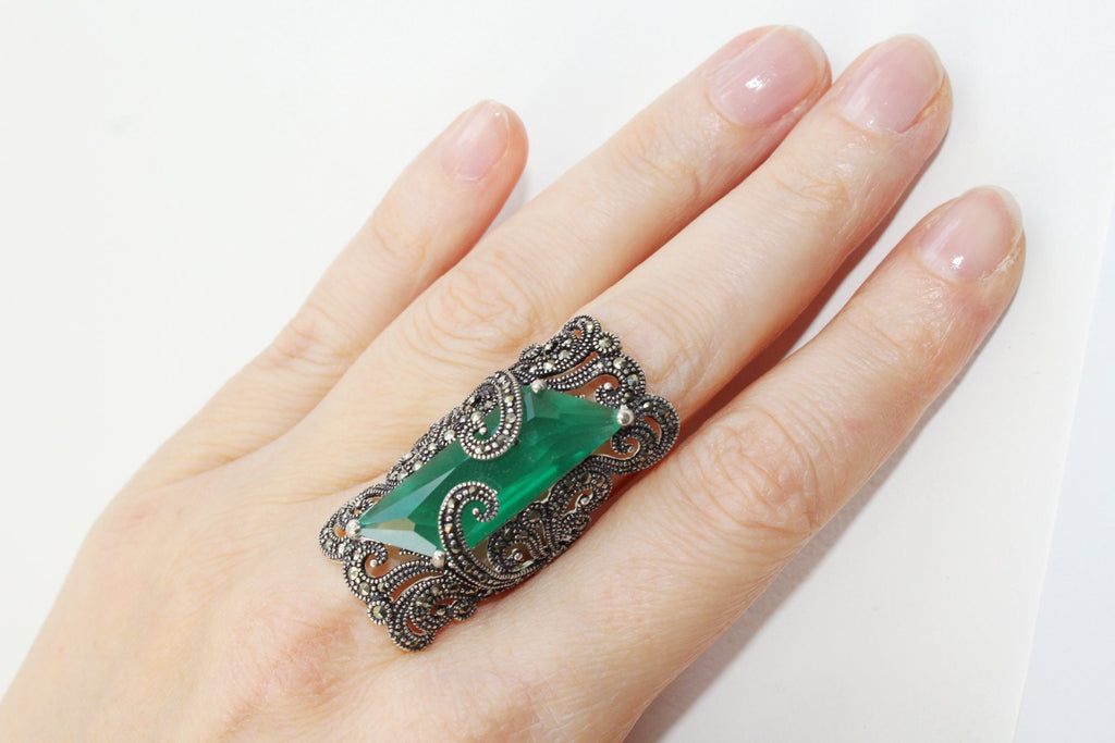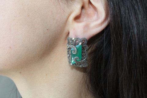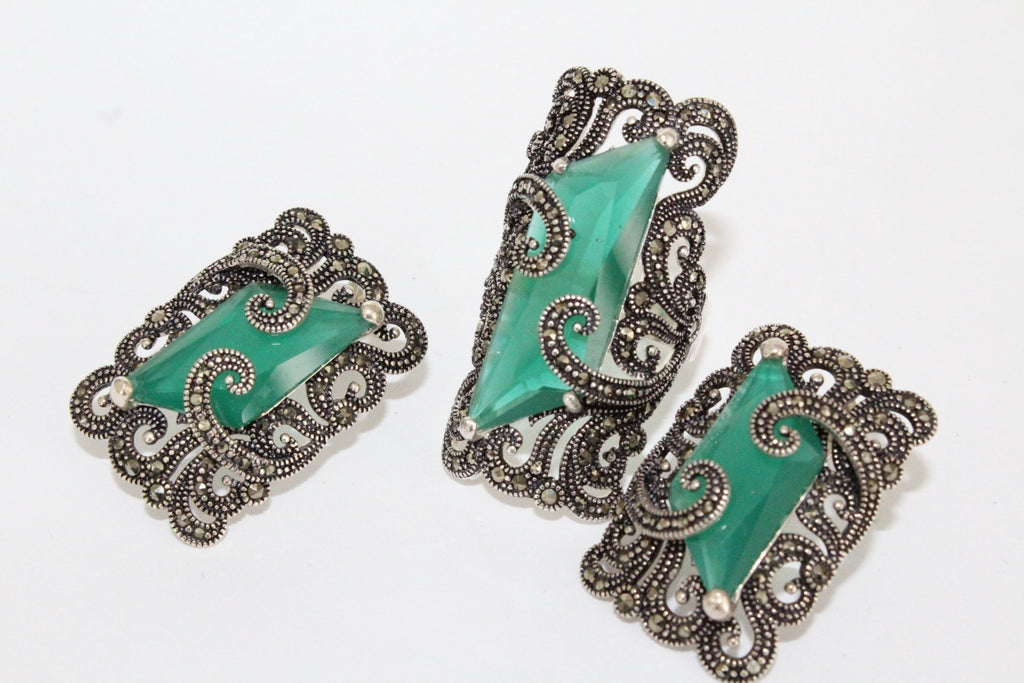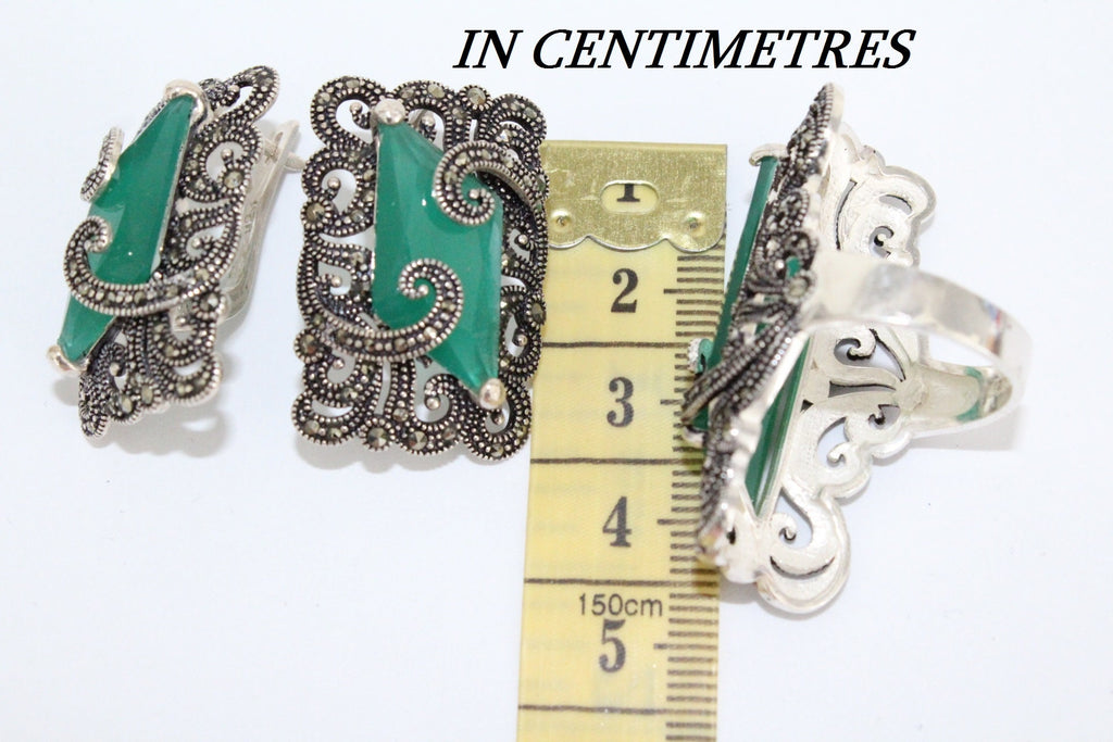 This is really a wonderful gift for a woman, not obliging to anything! Earrings and a ring made of 925 sterling silver with marcasite - shine with a chic shine on a woman of any age. Very beautiful and unusual green! These chic jewelry will brighten up your holiday and party. They are suitable for cocktail dresses and evening dresses. You can also pick up such an amazing jewelry for a dress on the occasion of graduation.