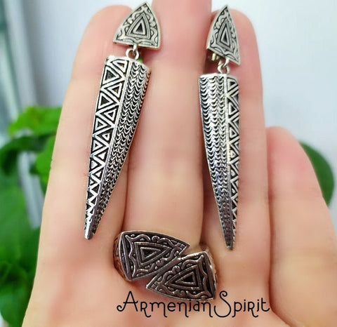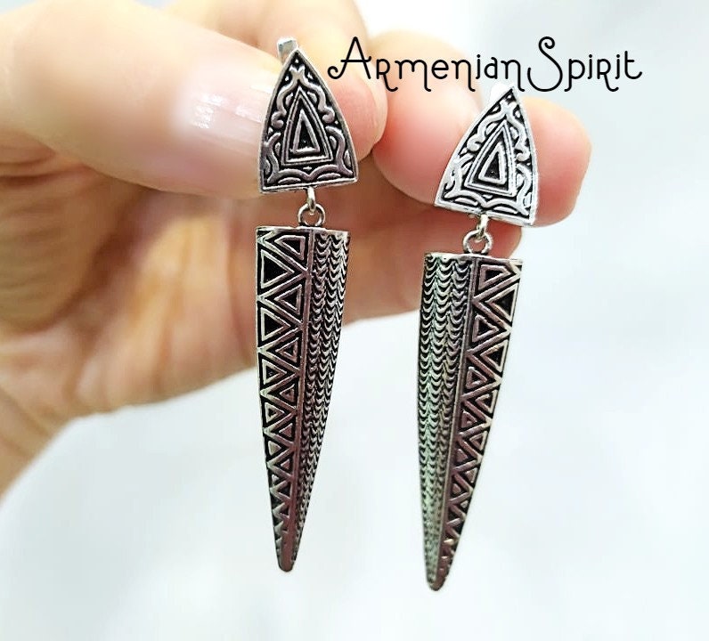 Discover the beauty and uniqueness of Armenian jewelry with our silver 925 dangle earrings. The triangle sharp design adds a touch of Bohemian and ethnic flair, making them perfect for spring and all-year-round. Enjoy the Best Armenian Spirit jewelry! All of our 925 stamped sterling silver pieces are handcrafted with care in our reliable store. Enjoy free shipping worldwide and discounts for all your jewelry needs. Shop with confidence knowing our dedicated customer care team is here for you.
