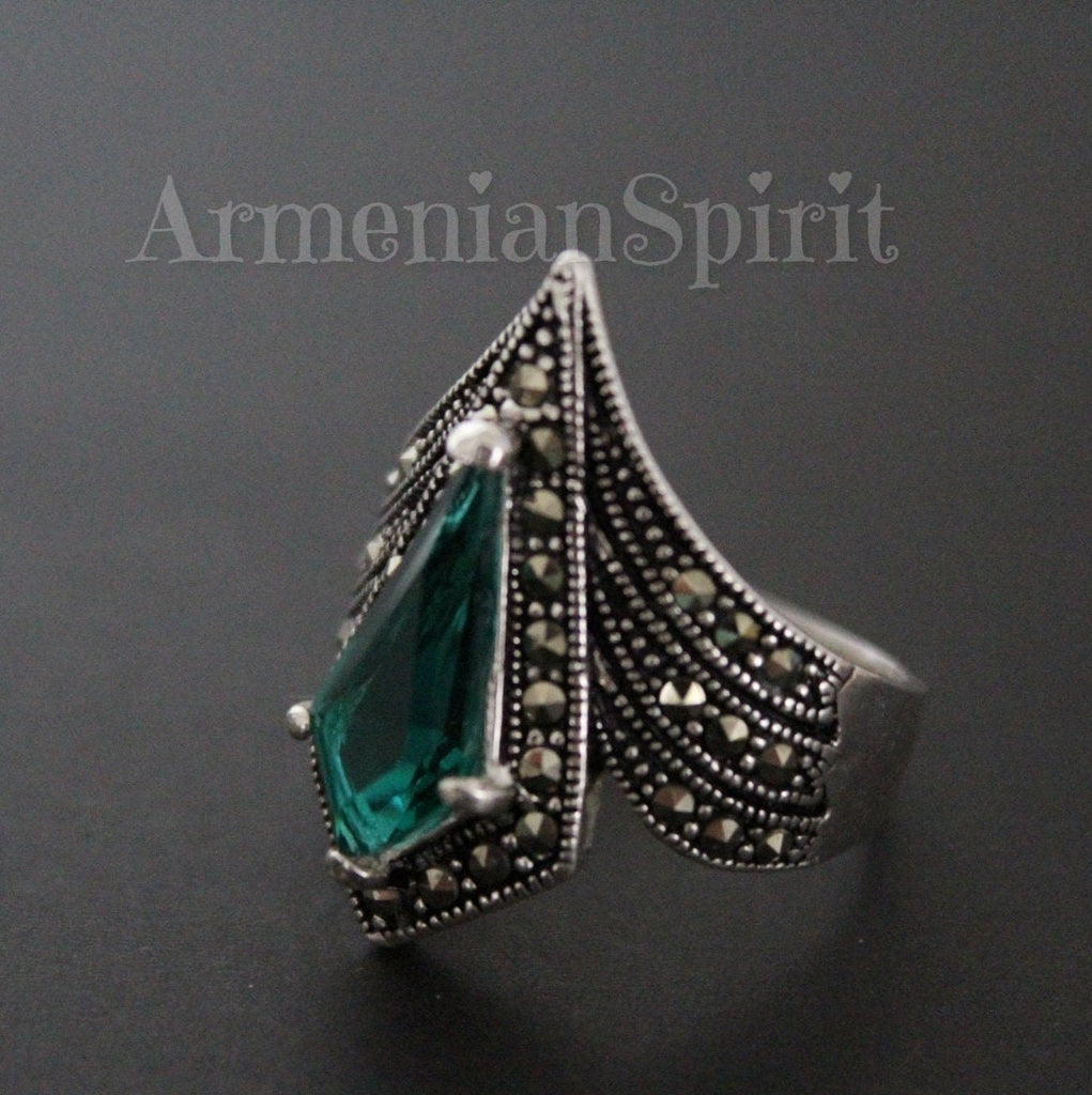 Enhance your style with our high-quality Armenian jewelry from our Armenian Spirit store. Made from sterling silver, our pointed rings feature a marcasite design and a stunning lab topaz stone in emerald green. Elevate your look with 925 silver. Looking for the perfect jewelry for sensitive skin? Look no further than our hypoallergenic jewelry, made with high-quality materials. With free shipping worldwide, you can shop with confidence at our top-rated 5-star store, trusted by customers worldwide. WE MAKE THIS RING IN ANY COLOR (stone): RED, BLUE, BLACK, BROWN, GREEN, PINK, etc.
