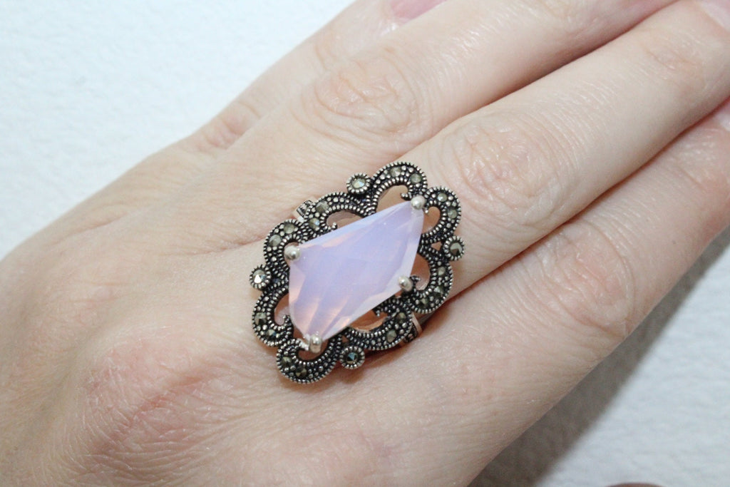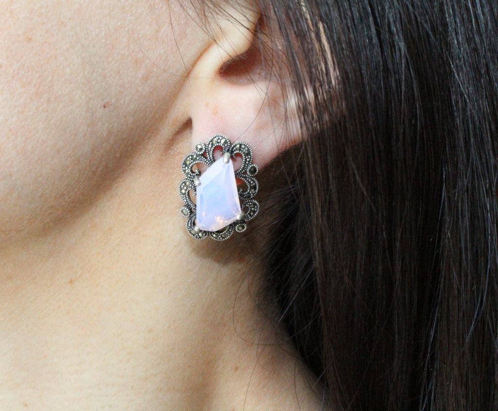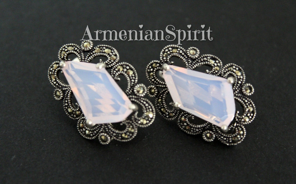 Add a touch of Armenian spirit to your everyday look with our high-quality, nacreous pink earrings and ring set. The Victorian style and Renaissance inspired design are sure to catch eyes, while the sterling silver and marcasite add a shiny and bright finish. Perfect for gifts or treating yourself! WE MAKE THIS SET IN ANY COLOR (stone): RED, BLUE, BLACK, BROWN, GREEN, PINK, etc.