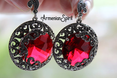 Experience the timeless elegance of Armenian jewelry with our store's Very Large Dome Earrings. These stunning earrings feature a bold red stone and intricate Marcasite detailing in silver 925. Their size makes them perfect for queen cosplayers and stage actresses alike, adding a touch of luxury to any outfit. WE MAKE THIS SET IN ANY COLOR (stone): RED, BLUE, BLACK, BROWN, PINK etc.