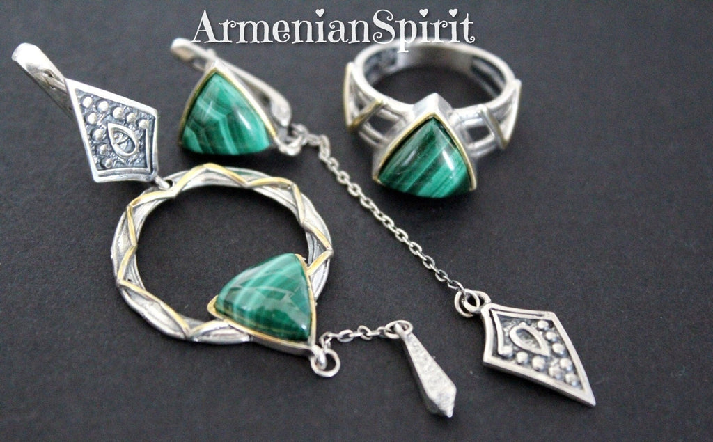 Elevate your style with our beautiful Armenian Silver 925 Ring from our store, Armenian Spirit on Etsy. Crafted with high-quality materials, this modern piece features gold-plated accents and a stunning green malachite triangle gemstone. Perfect for adding a touch of elegance to any outfit, especially green dresses. The best gift for any jewelry lover. Get the best gifts for your loved ones with our hypoallergenic jewelry! Perfect for those with sensitive skin. Plus, enjoy free shipping worldwide from our top store. They'll be the most wanted gifts this season!