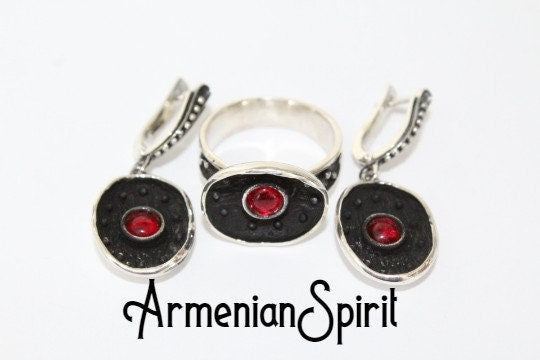 Add a touch of elegance with this stunning jewelry set from our Etsy shop. Crafted from high quality 925 sterling silver, the black poppy flower design is accented with a deep red garnet stone. The oxidized finish gives it a dark, sophisticated look that will elevate any outfit. Perfect for adding a pop of color to your wardrobe.