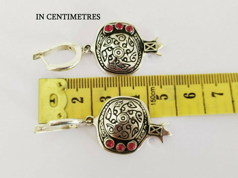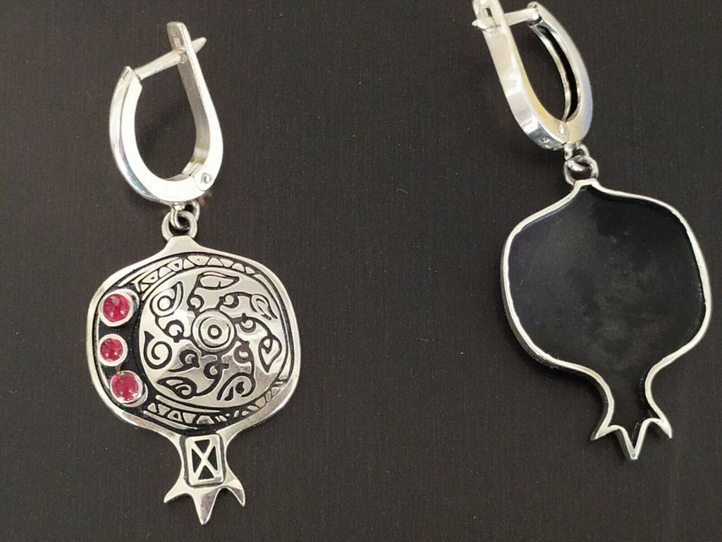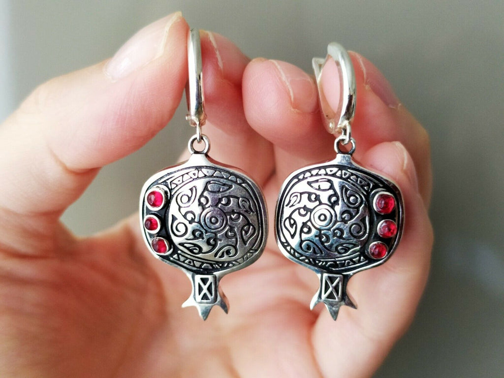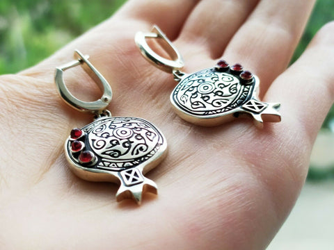 Celebrate Armenian heritage with these striking pomegranate earrings, where tradition meets sparkle. Crafted in sterling silver 925 with deep garnet-red stones, each pair features intricate ethnic ornament detailing that echoes timeless design. The pomegranate—a symbol of abundance and prosperity—becomes wearable art. Perfect for those who honor their roots and love jewelry that tells a story.