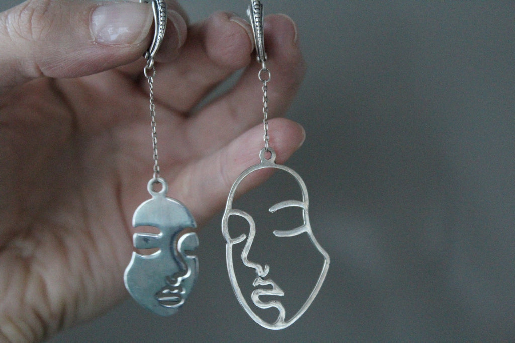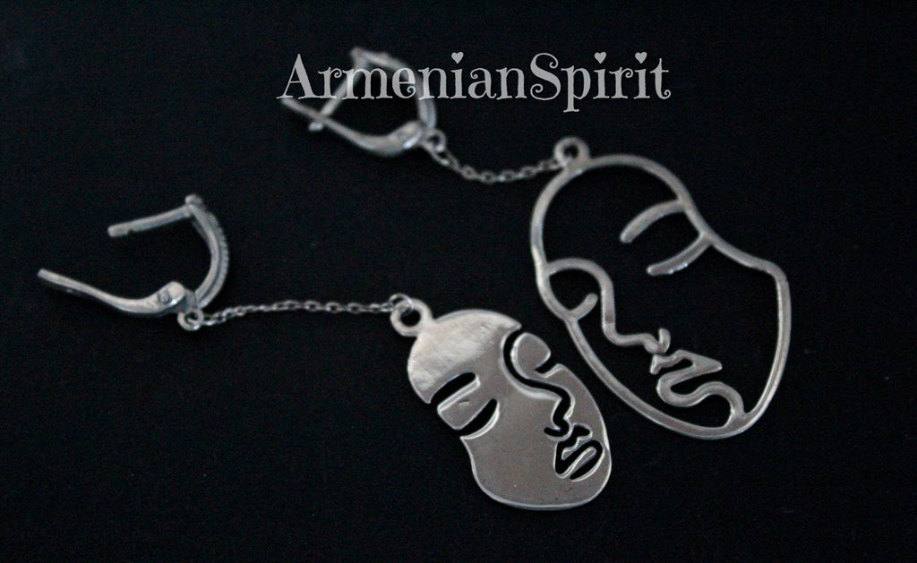 Discover the perfect gift at Armenian Spirit's best store for gifts. Our high-quality art earrings feature faces of a mand and a woman on long chains, crafted from sterling silver 925 for a stunning addition to any outfit. Ideal gift for the art lover or theatre actress in your life. Experience luxury jewelry with Armenian Spirit's etsy store. Our pieces are designed for sensitive skin, free from irritations. Enjoy free shipping worldwide with a tracking number and discounts available. Shop now and elevate your style!