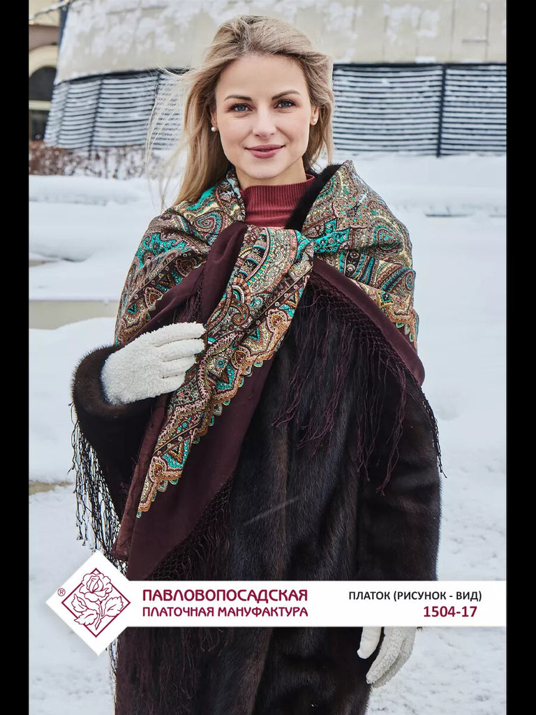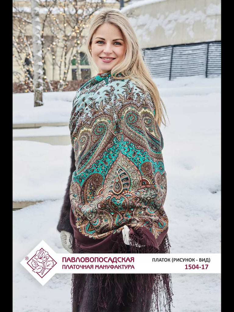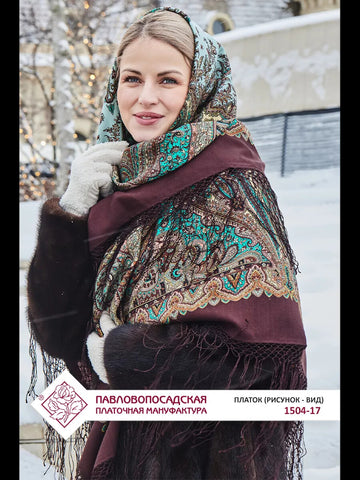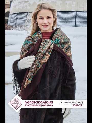 A 58-inch, 100% merino wool shawl featuring vibrant colors in a traditional Russian design. Showcasing an intricate herbal-inspired pattern in chocolate brown, accented with turquoise and mustard, this shawl exudes elegance and cultural charm. Soft, warm, and lightweight, it is finished with delicate silk fringes, adding a touch of refinement. Perfect for making a bold yet timeless statement, it blends heritage craftsmanship with contemporary sophistication, making it a versatile and luxurious accessory for any occasion.