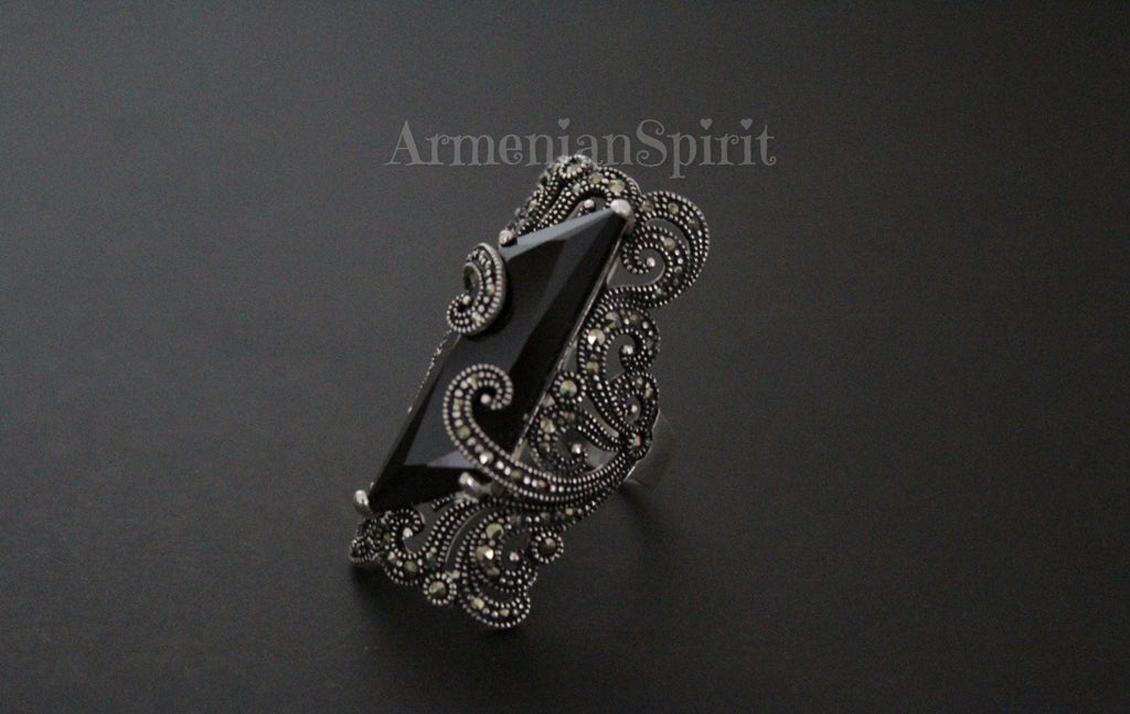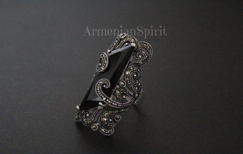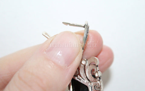 Elevate your style with these black sterling silver 925 earrings. Handmade in Armenia, each pair radiates luxury and sophistication. Perfect for parties, dinners, or evening events, these earrings will add a touch of glamour to any outfit. Enhance your rich lifestyle with these unique and elegant marcasite earrings.