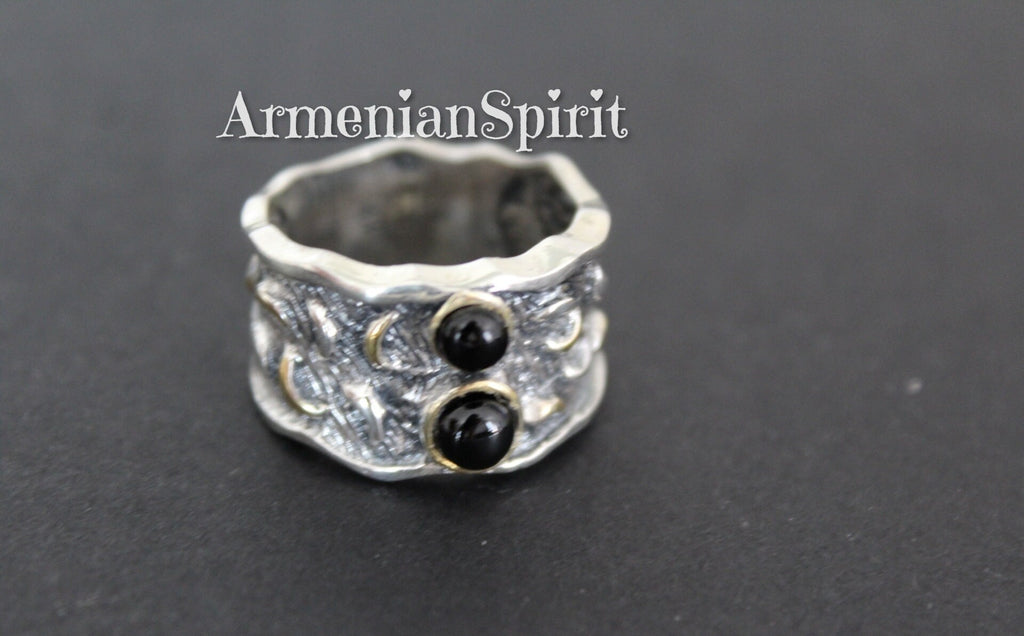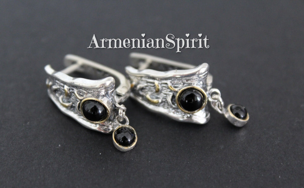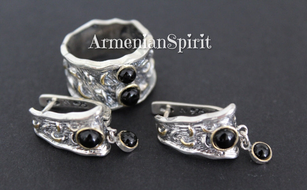 Elevate your look with this elegant and versatile Black Onyx gemstone earrings with dangling detail and ring. Handmade in Armenia with Silver 925 and gold plated parts, these small dangle earrings are perfect for a romantic date, special exhibition, or everyday office wear. Add a touch of sophistication to any occasion with this stunning jewelry set. Indulge in the best jewelry with Armenian Spirit store also on ebay. Our high-quality pieces are crafted with precision and care, ensuring the utmost satisfaction for our customers. Elevate your online shopping experience and add a touch of luxury to your collection. Join the exclusive world of our satisfied clientele.