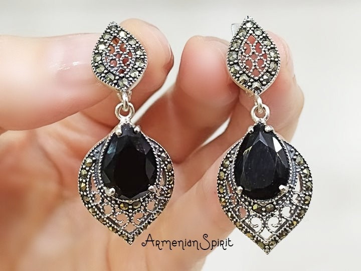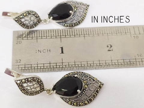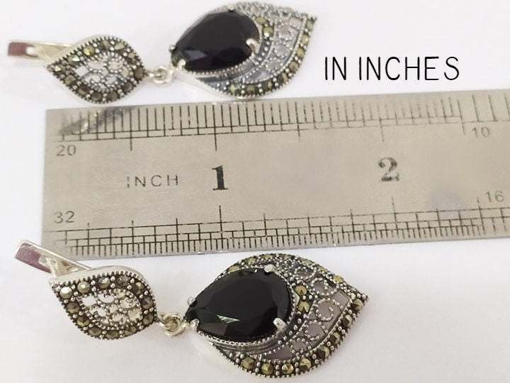 These Black Onyx Marcasite earrings crafted from Silver 925 combine timeless elegance with durability. The deep black onyx stones offer a striking contrast to the sparkling marcasite accents, making them perfect for both everyday wear and special occasions. Designed to complement any outfit, these earrings provide a sophisticated touch while ensuring comfort and lasting quality. Ideal for those seeking classic style with a modern edge.