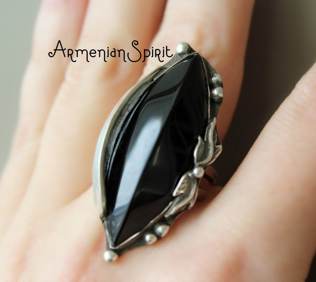 Big rings always attract attention. There will be twice as much attention if the ring is really memorable and luxurious. This ring is made with a special high taste in all the traditions of Armenian jewelry craftsmanship. Black shiny onyx and 925 sterling silver are an incredibly win-win combination of materials. The ring can be adjusted to fit your finger.