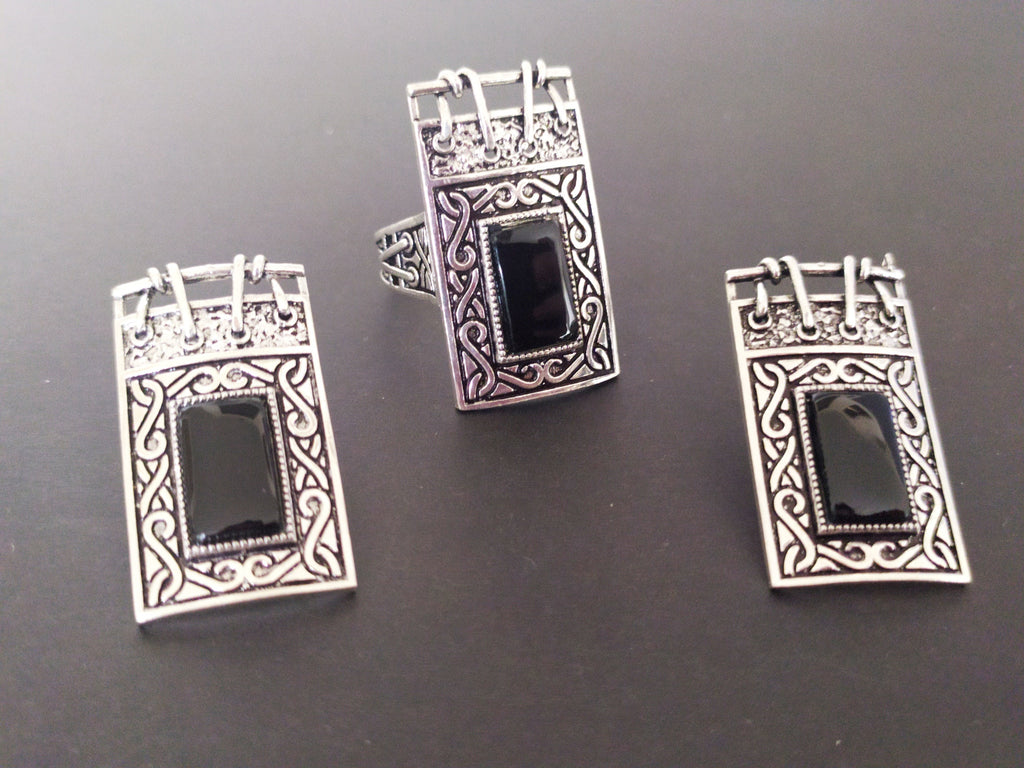 Elevate your style with our Best Silver Jewelry on Armenian Spirit. Handmade by Armenian artisans, this 925 silver set features a striking black onyx rectangle ring and traditional ornaments. Perfect for any occasion, its comfortable design makes it ideal for everyday wear, whether in the office or a night out. Make a statement with this unique piece. This handcrafted black onyx silver 925 jewelry set is perfect for every occasion, whether at work or for a night out. The unique rectangle ring adds a touch of elegance, while the dark color gives a bold and sophisticated look. Made in Armenia, this comfortable set is perfect for everyday wear.