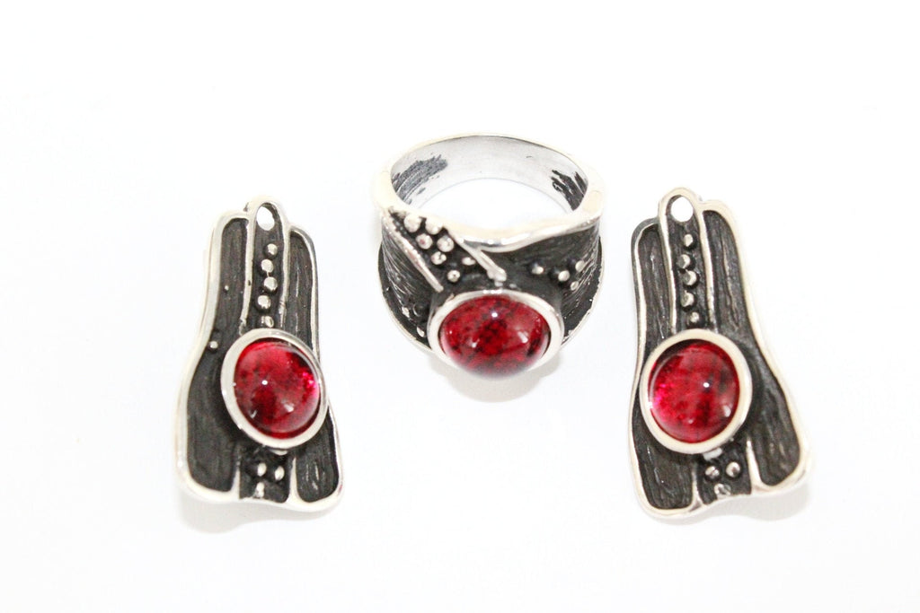 Discover the unique Black Silver 925 Garnet Red Set from our Unusual Jewelry Brands collection. This set includes stunning earrings and a ring with a round cabochon red stone, perfect for any occasion. Made with high-quality materials and available for purchase, shop our Armenian Jewelry online today.