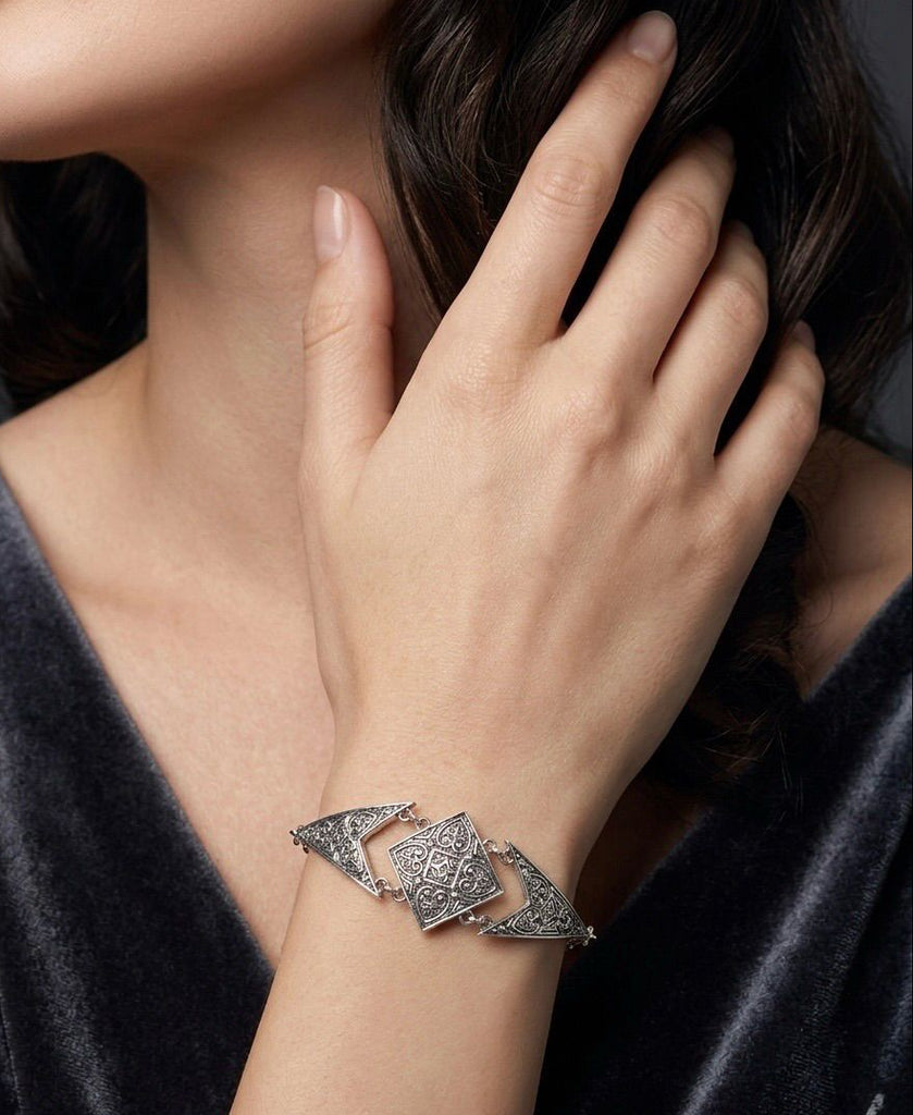 Handcrafted sterling silver 925 bracelet featuring the iconic Taraz pattern, a timeless symbol of Armenian heritage and craftsmanship. This traditional design showcases intricate work that reflects centuries of artisan skill passed down through generations. The adjustable chain allows a perfect fit for any wrist, combining comfort with elegance. Each piece is meticulously crafted to capture the essence of authentic Armenian jewelry, making it both a meaningful accessory and a connection to cultural legacy. Ideal for those who appreciate fine craftsmanship, cultural heritage, and jewelry that tells a story.