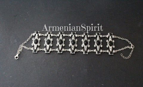 This ethnic chunky traditional bracelet is made from STERLING 925 silver and features black enamel detailing. Its intricate design is inspired by Armenian jewelry, making it a unique and timeless addition to your collection. Crafted with quality and precision, this bracelet is a must-have for any woman looking for a touch of culture and elegance in her jewelry.