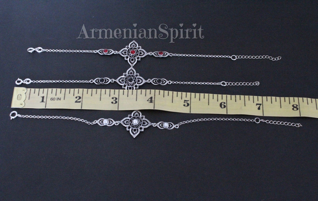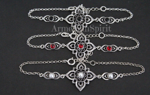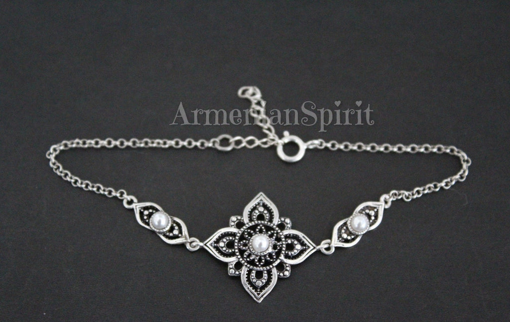 Wonderful jewelry for a gift made of 925 sterling silver. This bracelet is made in Armenian tradition with beautiful flowers in daraz style. The bracelet consists of a flower and small details, which are interconnected with a chain. Such bracelets will please a woman and cheer up for a long time! The bracelet will go well with boho style clothes, and will also look great even with office clothes, because it is simple and modest in its design, despite being made of the highest quality silver.
