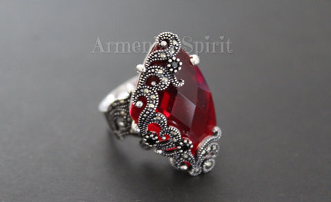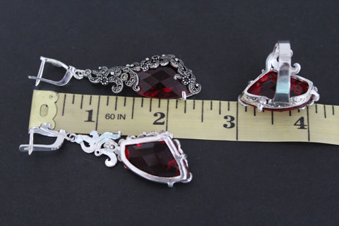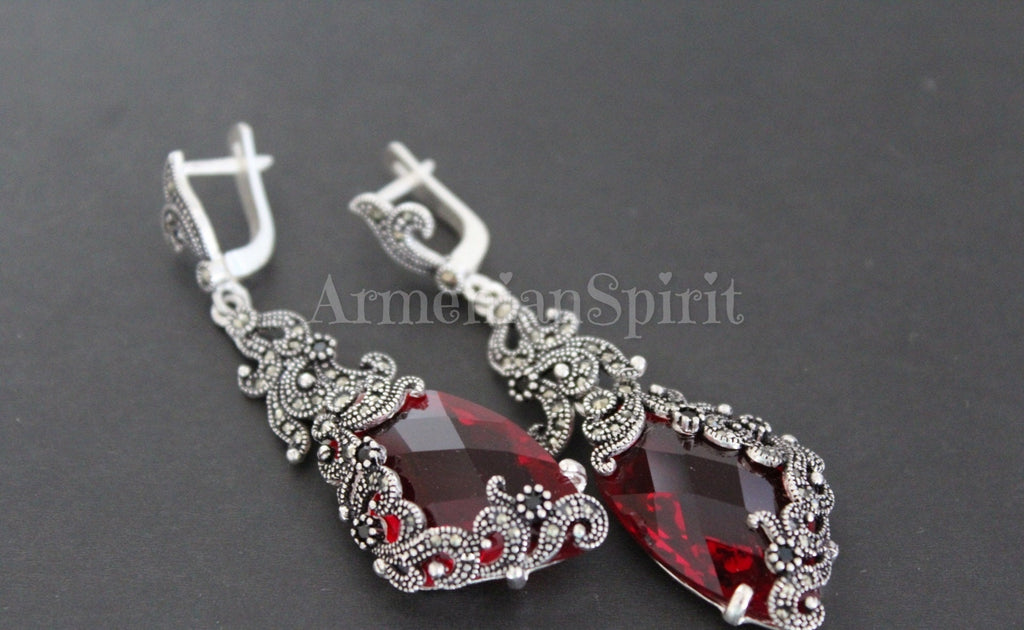 Add a touch of elegance and joy to any outfit with our Bright Red crystal ring and earrings set. Handmade with care, this Armenian jewelry features unique triangular Marcasite Silver designs that are sure to stir feelings of happiness and leave a lasting impression. Give the gift of unforgettable style to yourself or a loved one. Made with Marcasite Silver, it's available in various bold colors, including RED, BLUE, BLACK, BROWN, and PINK at our stores.