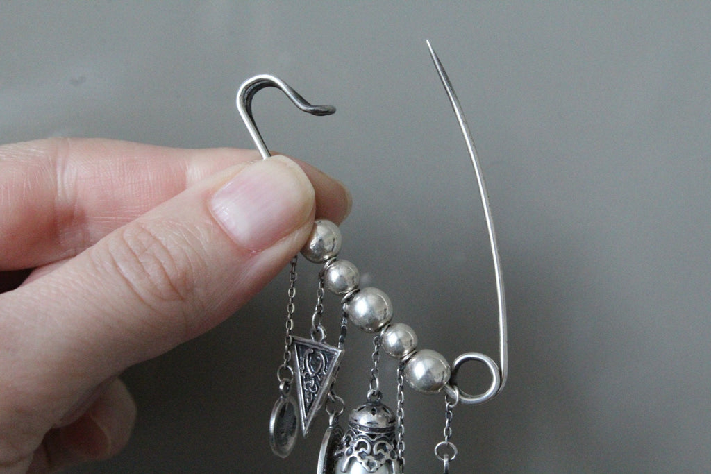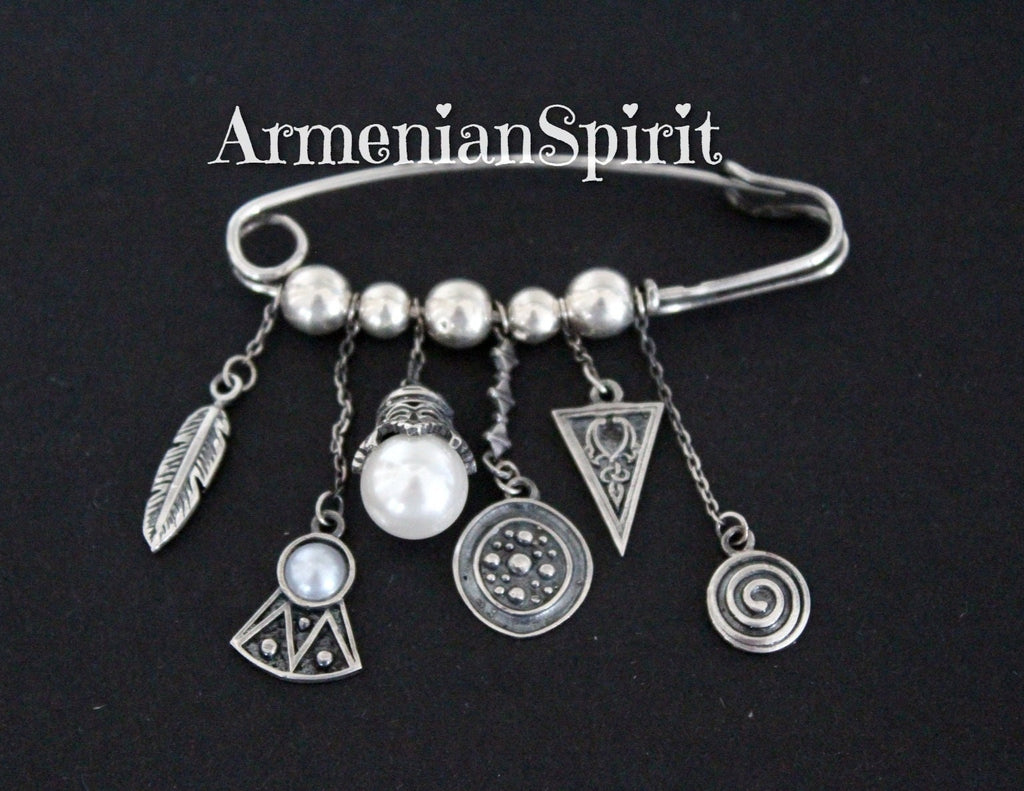 Looking for a unique gift for the bohemian woman in your life? This silver 925 brooch features a beautiful combination of symbols including a pomegranate, feather, pearl, and eternity sign. The perfect accessory to add a touch of whimsy and meaning to any outfit.