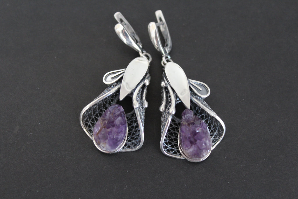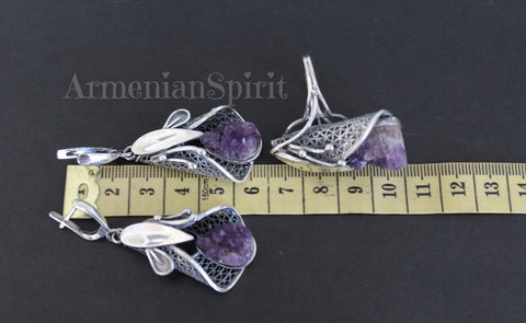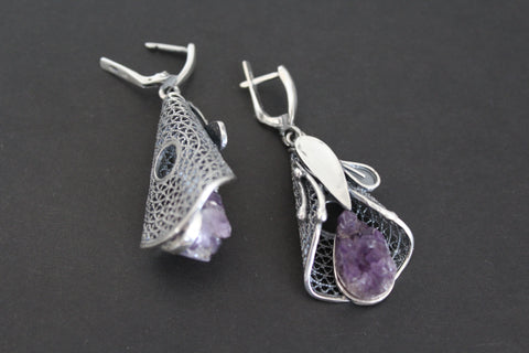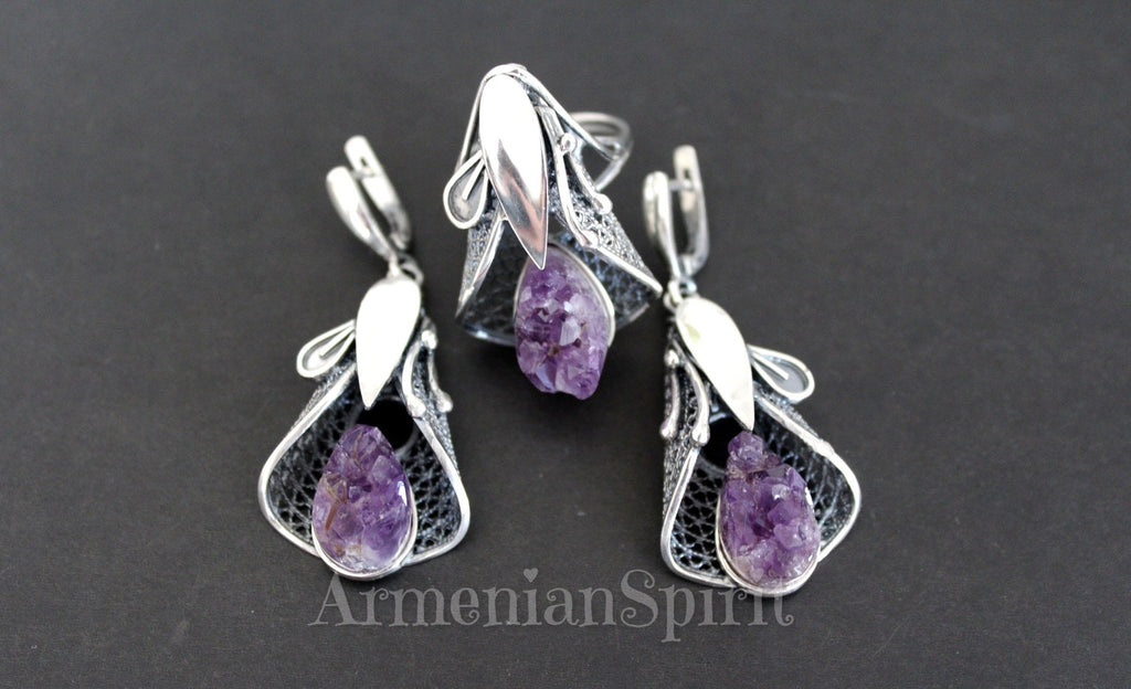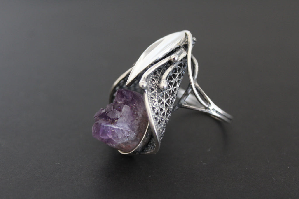 Looking for a statement piece? Our Calla Flower Large Ring, made of high-quality 925 sterling silver, features a stunning Amethyst druse gemstone. This unique combination adds elegance and flair to any outfit. Shop our Etsy store for the best in quality jewelry. Surprise your loved ones with this stunning piece of 925 sterling silver jewelry from our high quality Etsy shop. Featuring a beautiful cala flower design, it's the perfect gift for any flower lover. Shop now and treat yourself or someone special to the best jewelry!