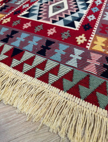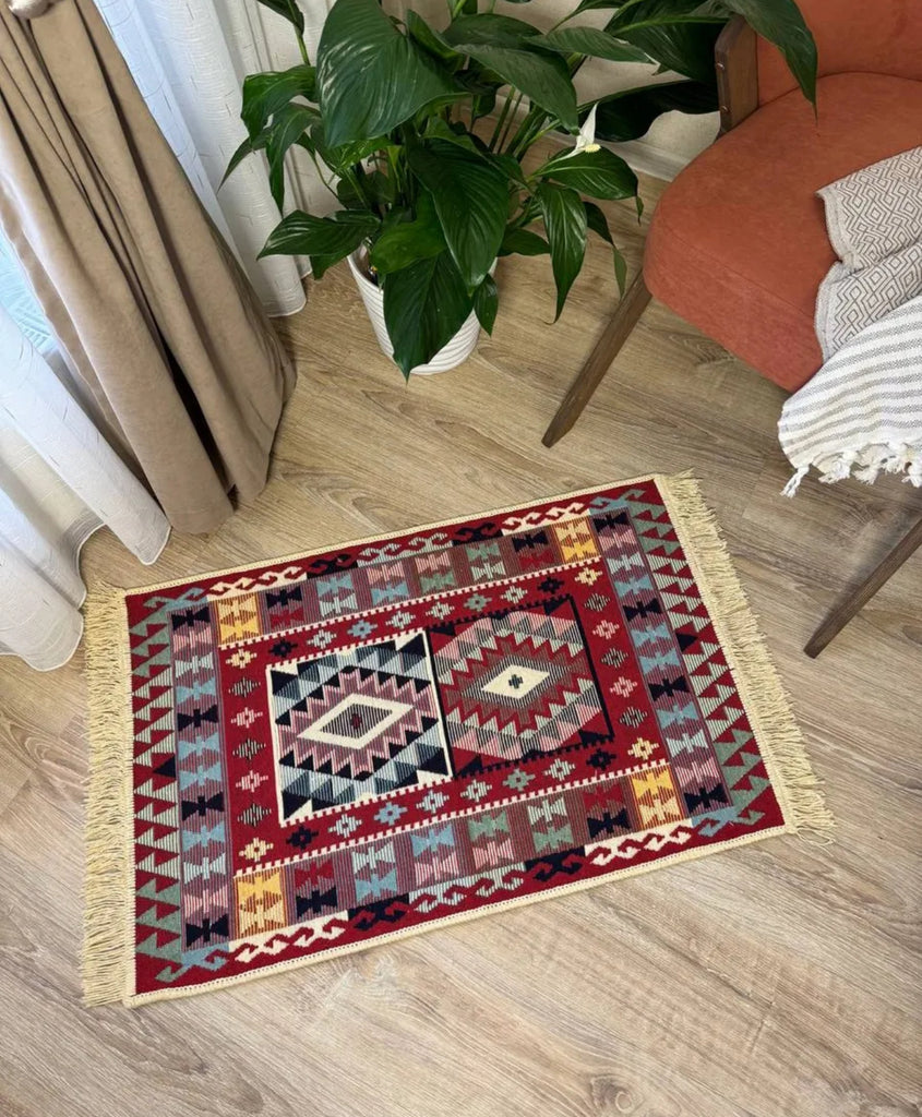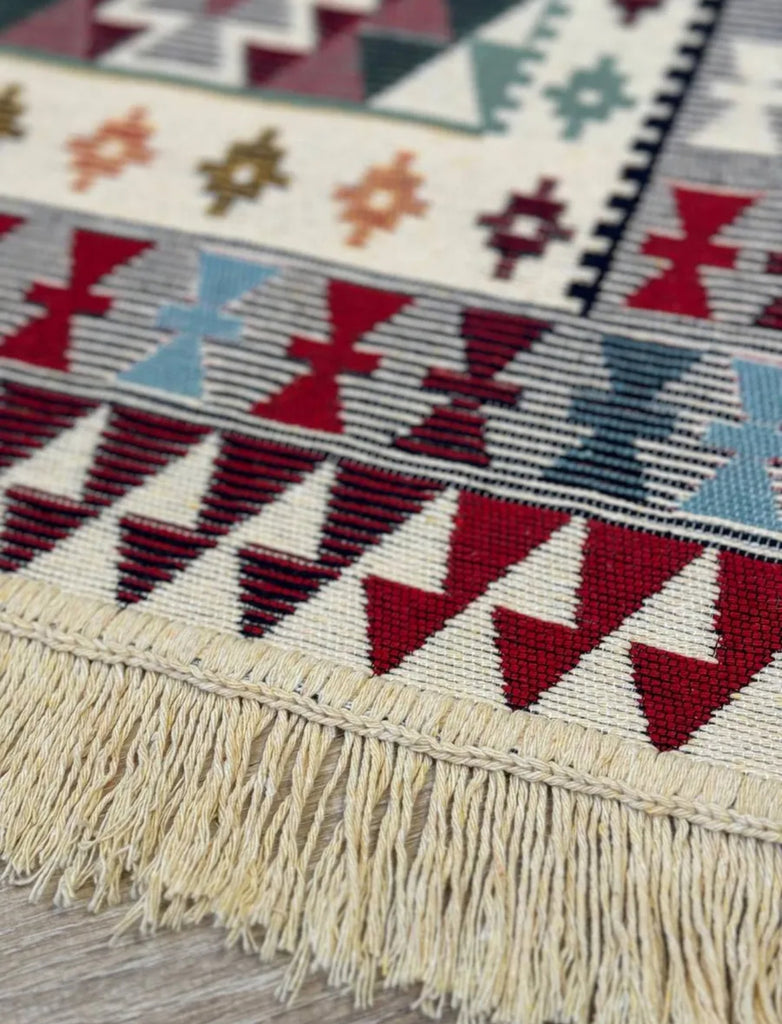 Bring warmth and tradition into your space with this reversible Armenian carpet, a timeless piece that celebrates heritage through vibrant design. Measuring 90x60 cm, it features authentic traditional ornaments in rich red tones, complemented by a palette of light green, soft blue, beige, and golden mustard accents. Crafted from quality cotton and polyester, this double-sided treasure lets you flip between two distinct looks—perfect for refreshing your décor whenever the mood strikes.
