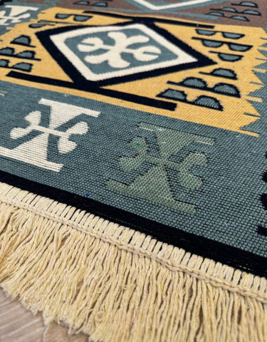 Bring warmth and character to your kitchen or bedroom with this charming reversible carpet, where traditional Armenian ethnic patterns meet modern practicality. Woven in rich greens and soft pale yellows with earthy beige accents, it's finished with inviting fringe that adds texture and movement. At 90x60 cm, it's the perfect size to anchor a cozy corner or define a space with farmhouse flair. Flip it over whenever you crave a fresh look—this two-sided treasure keeps your décor playful and your options endless.