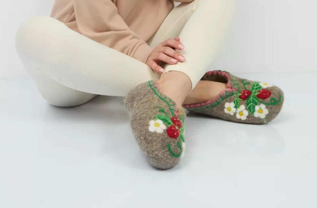 Step into comfort and coziness with these Chuni sheep wool slippers, perfect for anyone seeking a blend of warmth and style. Available in an array of sizes, these wide-fit Russian valenki slippers are designed to wrap your feet in luxury. The charming embroidery featuring flowers and strawberries adds a quaint touch to your at-home attire, making them ideal for leisurely evenings indoors or for those gentle spring, winter fall and summer days. Crafted from 100% sheep wool, these slippers boast a soft felt lining and insole, ensuring your feet remain comfortable year-round. The durable felt outsole provides stability, making these slippers a practical choice for indoor and even outdoor wear. With their timeless design and versatile color palette, they effortlessly complement any casual home outfit, granting you both comfort and style in one simple slip-on. It is not cold in the winter and not hot in the summer in these shoes, because the porous walls of these felt house shoes do not allow cold and heat to pass through, causing sufficient microcirculation to save the feet from overheating and not overcool them.