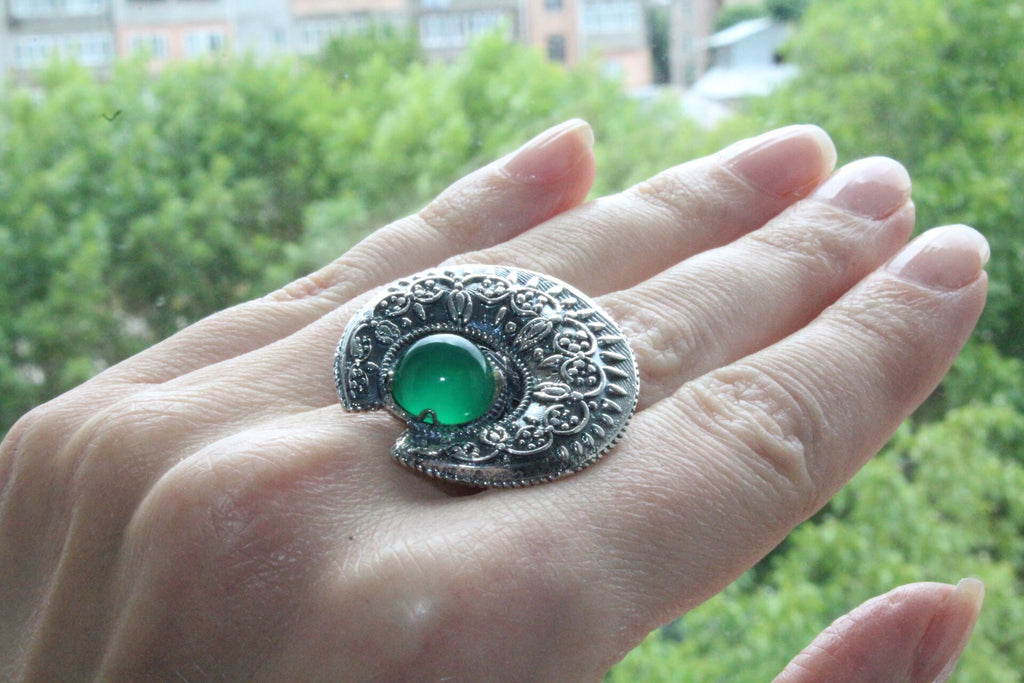 For lovers of very large gypsy-style earrings. These earrings and ring are made from 925 sterling silver. In the middle is a red coral stone. Please note that the color of the stone shade may not match the photo, as the stones are natural. We make the same set with different gemstones. If you have preferences, just message me.If you are looking for gifts for your loved ones, then in my store there is a very wide selection of different types of jewelry for every taste. You can pick up earrings, necklaces, pendants, rings, broches with both natural and artificial stones. As for the material, our jewelers work only with very high quality 925 sterling silver.