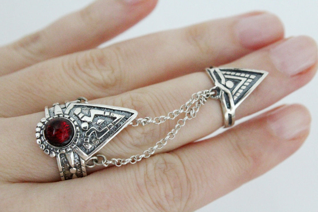 Introducing our double ring SILVER 925, a unique piece of Armenian jewelry with a red stone triangle and pointed Western Armenian jewelry design. Made with high quality craftsmanship and adjustable for a perfect fit. Perfect for those seeking an unusual, ethnic touch to their style. Handmade and available exclusively at our store, Armenian Spirit.