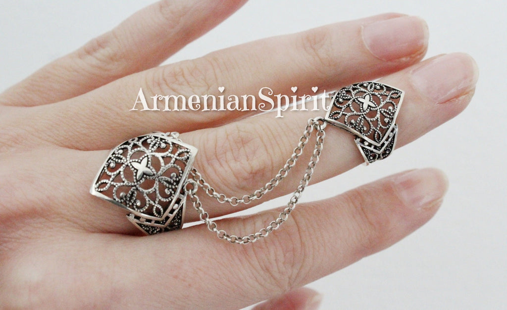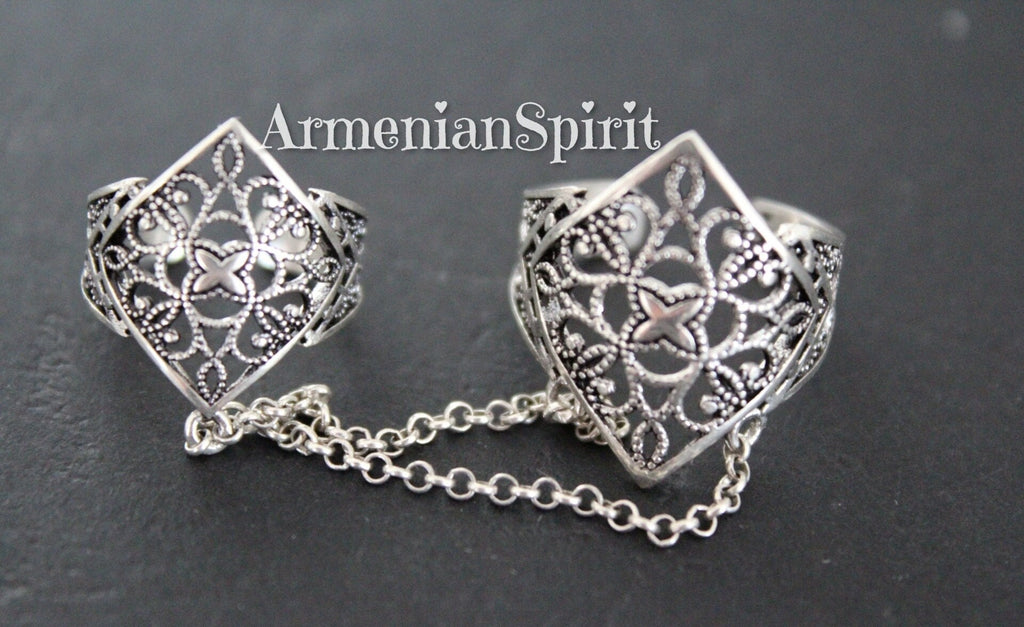 Expertly crafted with 925 silver, this double ring features a traditional Armenian pattern that is both beautiful and adjustable. Elevate your jewelry game with the best silver accessories on Etsy. Elevate your style with our best silver jewelry on Etsy. Crafted with precision, our ring perfectly complements traditional Armenian taraz folk dancers' outfits from various regions. Show off your cultural pride and sophistication with this unique piece from Western Armenia - Anatolia, Erzrum, Adana, Mush, Kars and Ani.