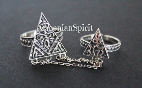 Enhance your style with this unique double ring silver 925 full finger jewelry. Handcrafted with traditional Armenian patterns, this adjustable designer piece features two chains for a trendy touch. Made with high quality sterling silver, this jewelry is perfect for any occasion.