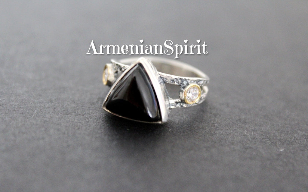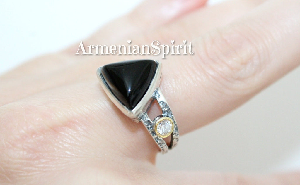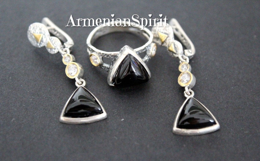 Enhance your look with this elegant set of Armenian jewelry. The earrings and ring feature a stunning design with black onyx and white zircon stones, all set in Sterling SILVER 925 with gold-plated details. Elevate your style with this beautiful and versatile purchase on Armenian Spirit. Find the perfect gift on Armenian Spirit with our selection of unique Armenian jewelry. With our handpicked collection, you're sure to find the best choice for any occasion. Shop now and discover the best gift ideas for your loved ones.