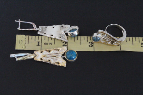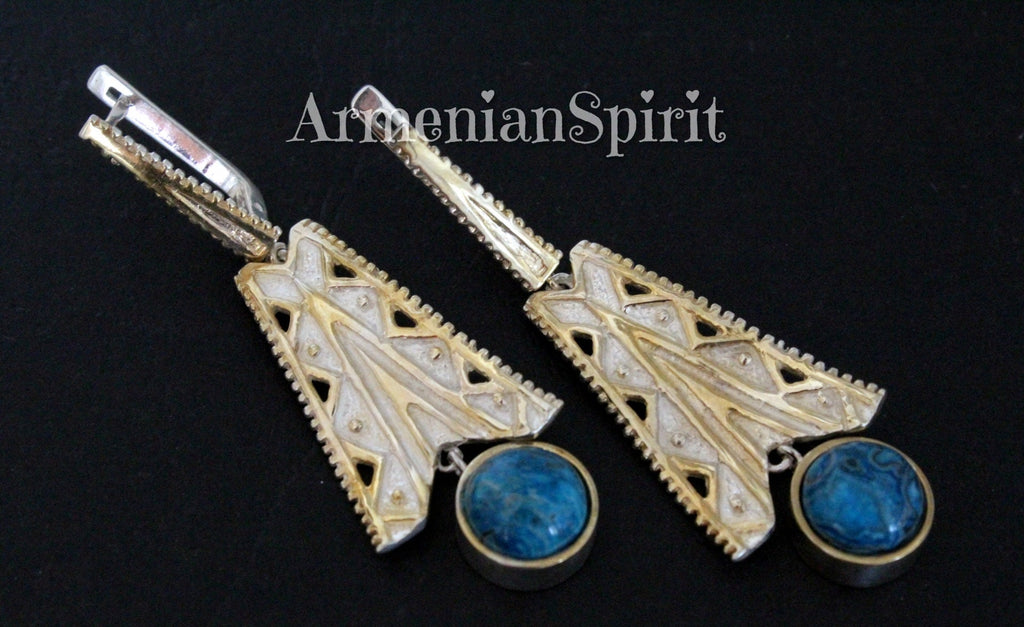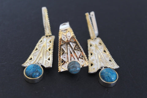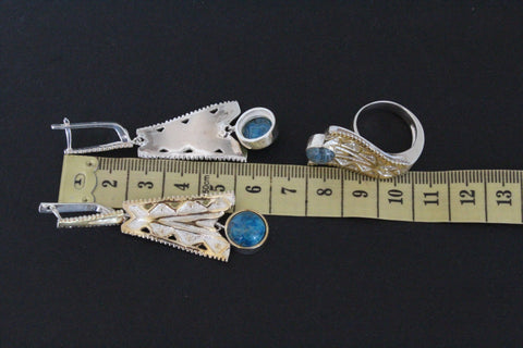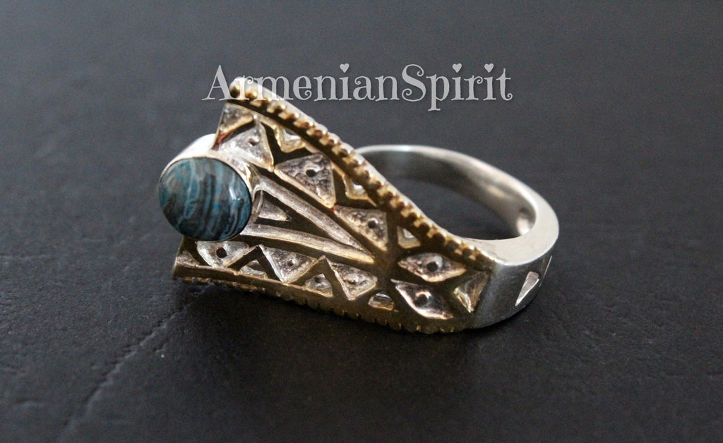 Complete your jewelry collection with our high quality Blue Chrysocolla earrings and ring set from our Armenian Etsy store. Each piece is crafted with 925 sterling silver and gold plated details for a luxurious touch. Elevate your style with these unique and beautiful Armenian jewelry pieces. Experience the luxury of hypoallergenic and sensitive-free jewelry from one of the world's top-rated stores, Etsy. Enjoy worldwide free shipping, with a 5-star customer satisfaction rating. Elevate your style with confidence and comfort.