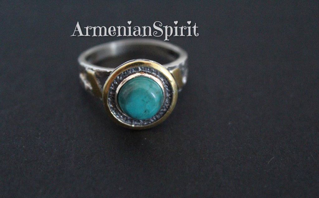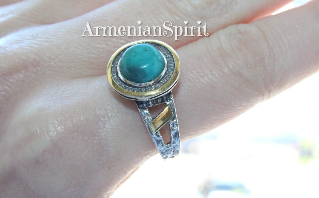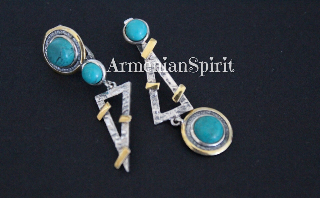 Take a risk and add these adventurous Earrings and ring to your collection! Crafted from Sterling Silver 925 and gold plated details, these Armenian earrings feature a stunning blue turquoise stone, known for bringing good fortune. Perfect for all zodiac signs, especially for Sagittarius and Capricorn birthstones. Discover the beauty of Armenian jewelry with these handcrafted Sterling Silver 925 jewelry set from a top-rated seller on Armenian Spirit. Perfect for jewelry buyers, these earrings are a must-have addition to any jewelry collection.