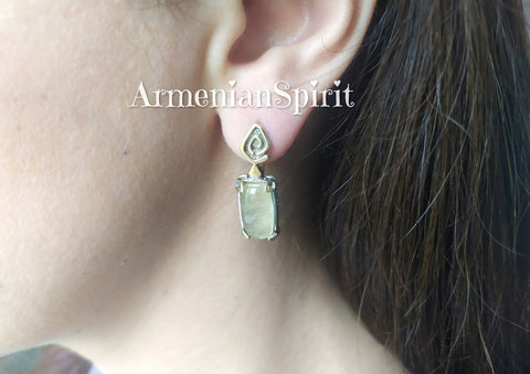 Shop for stunning artisan jewelry with Armenian Spirit! Our gold plated earrings and ring feature a beautiful gray and black tint Venus hair gemstone cabochon. Make a statement with our high quality, handcrafted pieces, perfect for gifts or treating yourself. Find the perfect piece of jewelry at Armenian Spirit, where we offer free shipping worldwide with a tracking number. Our jewelry is designed for sensitive skin, so you can wear it without any irritations. Plus, take advantage of our discounts to save even more! Shop now and enhance your style without worrying about irritation.