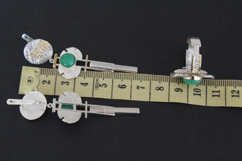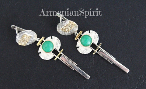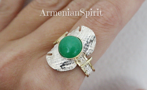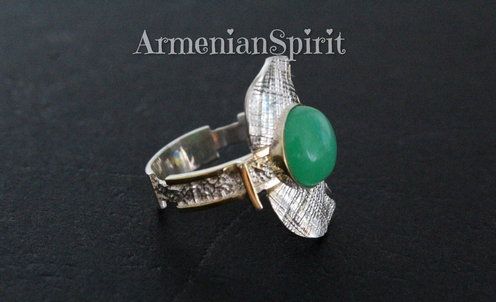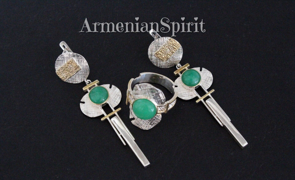 Elevate your jewelry collection with our stunning Armenian Spirit earrings and ring set. Handcrafted from high quality sterling silver and adorned with luxurious gold plated details, these pieces feature beautiful green chrysoprase stones. Perfect for adding a touch of elegance to any outfit, and makes for a thoughtful and unique gift. Shop now on Etsy, the best store for gifts. Introducing jewelry from the Armenian Spirit Etsy store. Our handcrafted pieces are perfect for those with sensitive skin as they are irritation-free. Enjoy free worldwide shipping with a tracking number and special discounts. Elevate your style and skin with our unique designs.