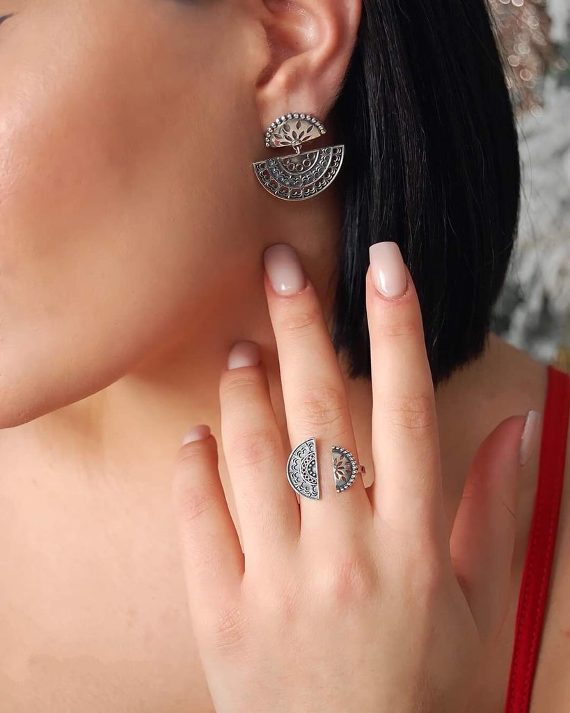 Discover the timeless beauty of traditional Armenian design with our sterling silver jewelry. Crafted with 925 silver, our earrings and ring feature intricate Western Arenia ornamentation. Elevate your style with elegance and quality.