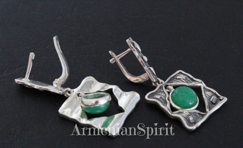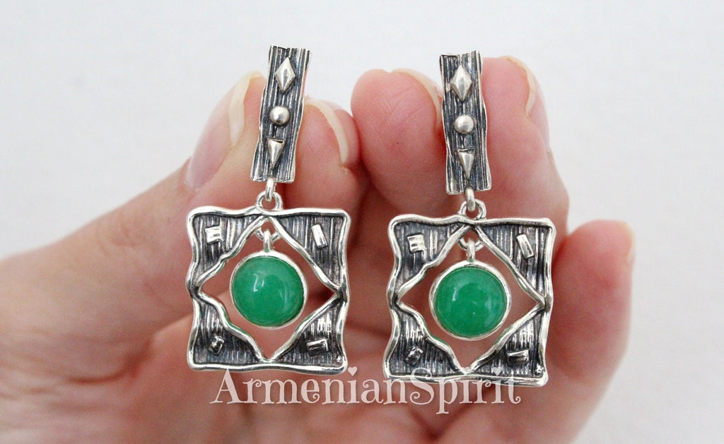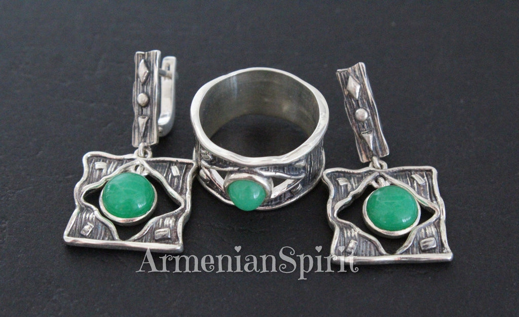 Add a touch of Armenian charm with these sterling silver 925 square earrings and ring, featuring a stunning round green jadeite gemstone. Free shipping Worldwide and excellent service from your favorite Armenian jewelry store. A must-have addition to your collection! Add some shine to your wardrobe with our high-quality 925 stamped Armenian Spirit jewelry!
