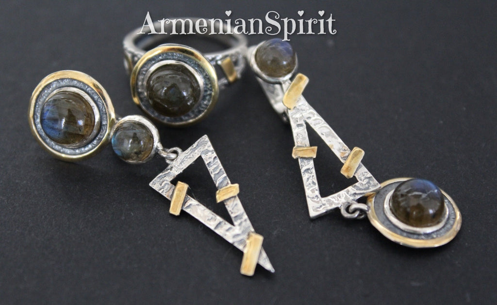 Add a touch of elegance to your everyday look with our stunning Armenian inspired earrings. Add a touch of modern elegance to any outfit with our geometric vice versa earrings. Made with high-quality sterling silver and adorned with gold plated details, these blue gray labradorite earrings are the perfect addition to your jewelry collection. Elevate your style with our unique and timeless piece from Armenian Spirit. Finished with a 925 stamp mark, our Armenian jewelry is the perfect combination of style and quality.