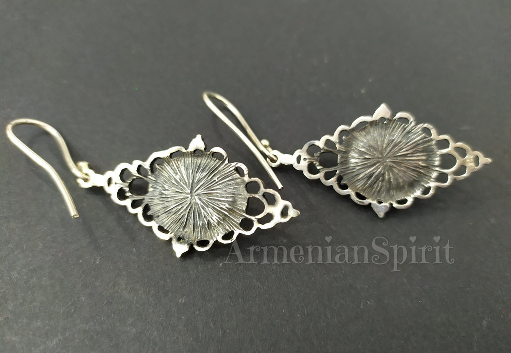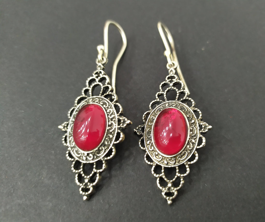 If you want to buy beautiful medieval style sterling silver earrings, then check out these 925 sterling silver earrings made with beautiful antique patterns. The earrings are made with hooks and the stone is a red artificial cabochon. Earrings are perfect for vintage style clothes, also it will be a great gift for older women.