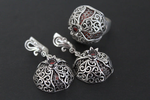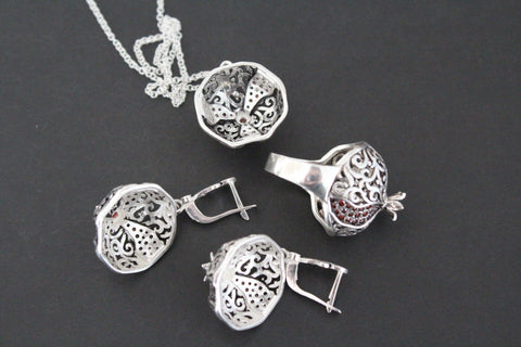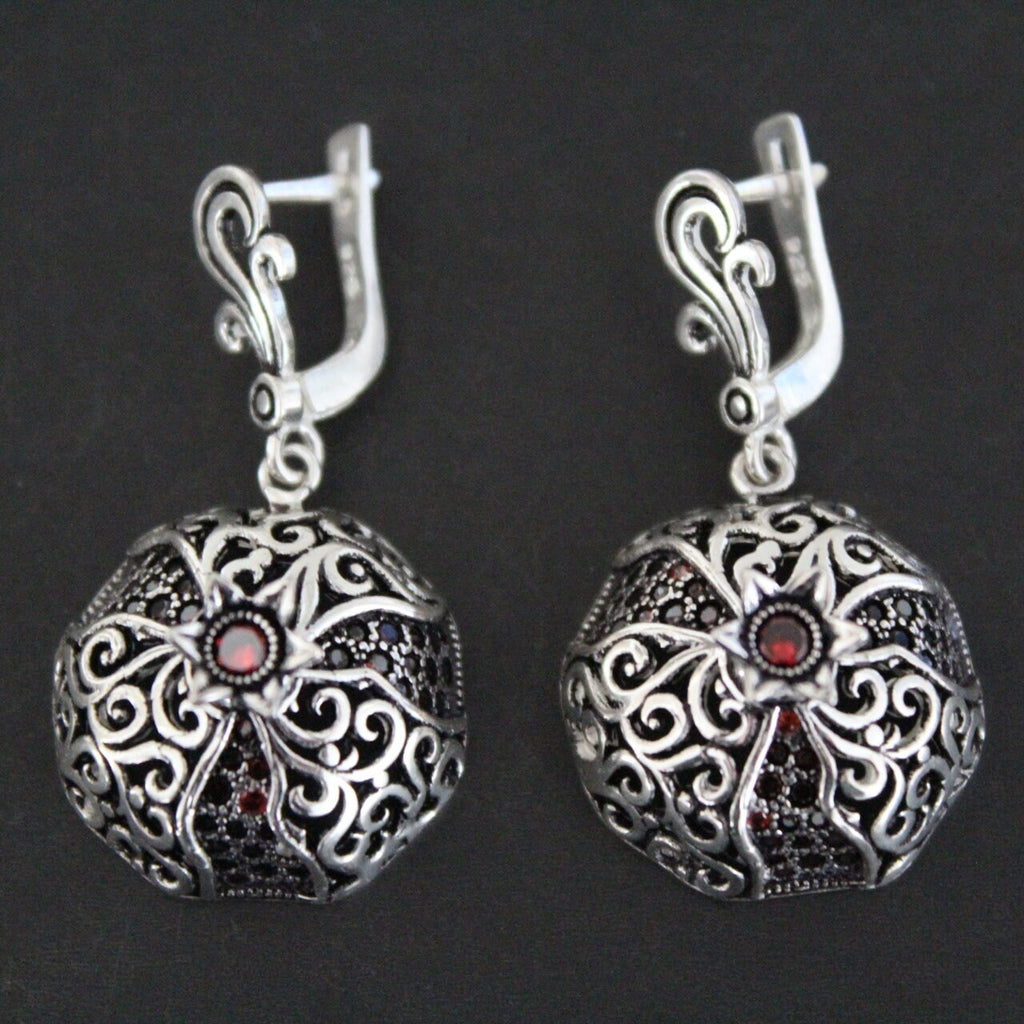 Earrings made of pomegranate shape dangle Sterling silver 925 with natural faceted garnet natural is a symbol of Persephone