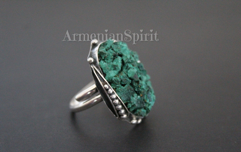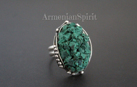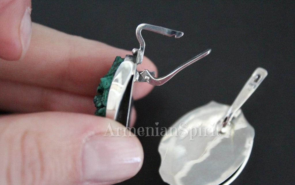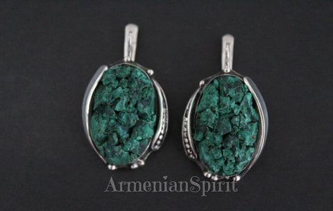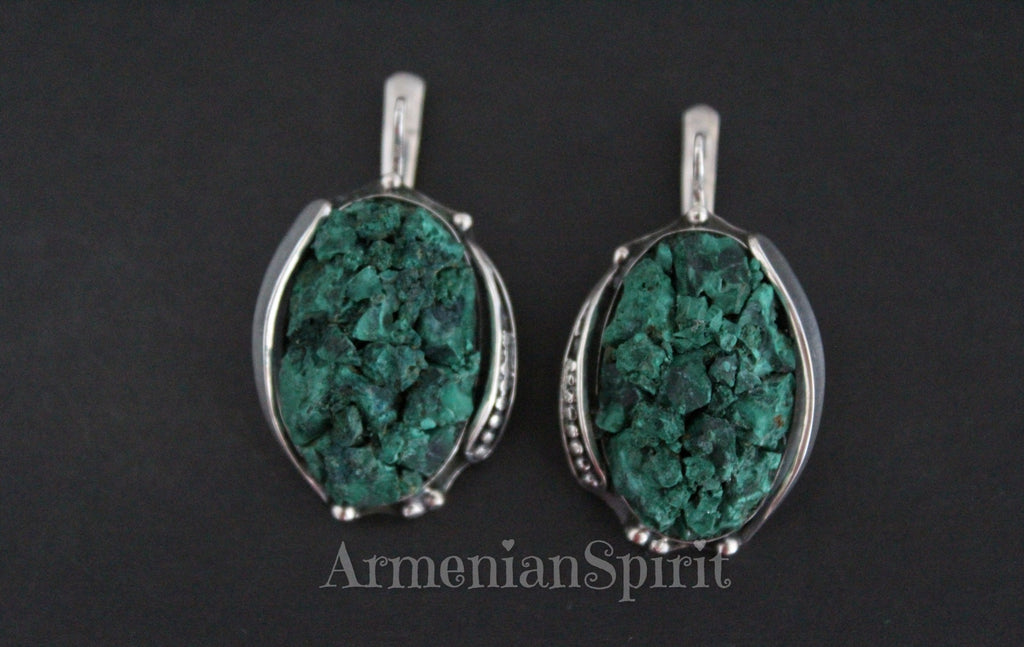 Expertly crafted by Armenian artisans, these earrings feature real malachite stones and high-quality silver 925. The green druze stones add a unique touch to this handmade jewelry, making it a beautiful and one-of-a-kind piece. Elevate any outfit with these stunning earrings.