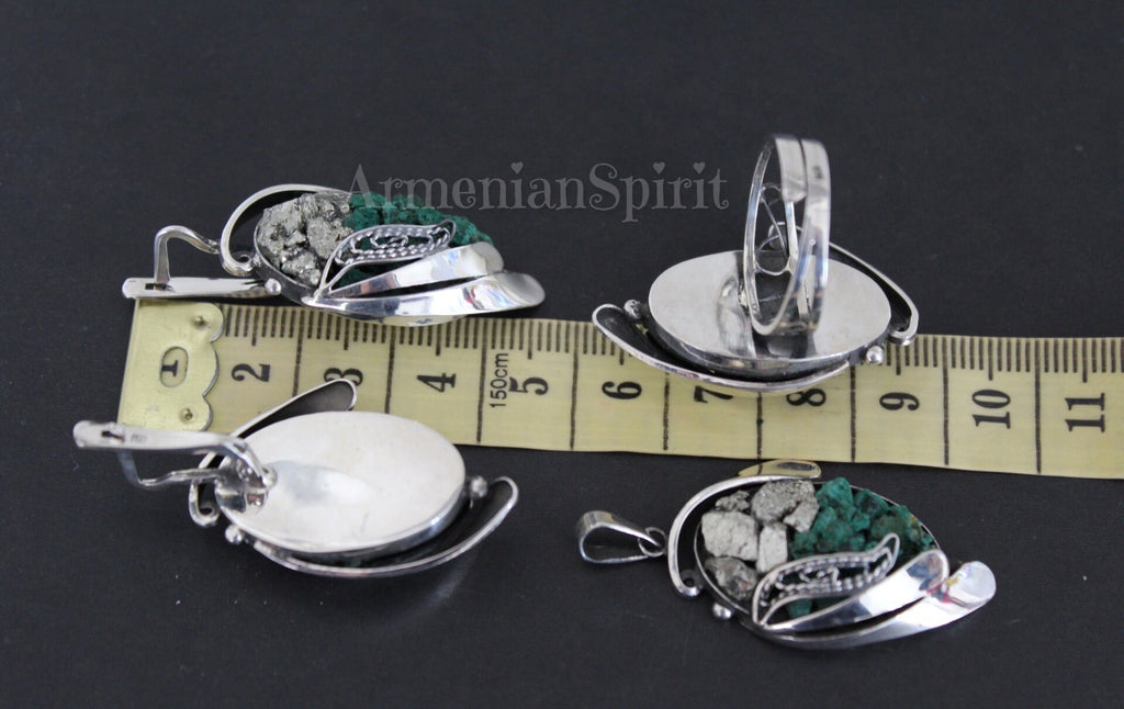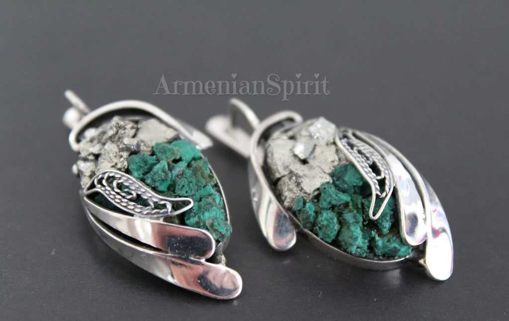 Find unique and exquisite earrings on Armenian Spirit. Made with Sterling Silver 925, these earrings feature natural Pyrite golden druzy and green malachite for a beautifully intricate design. Discover the exquisite world of handcrafted jewelry with Armenian filigree. Shop on Etsy for one-of-a-kind pieces and enjoy free shipping, exceptional customer care, and exclusive discounts. Elevate your style with unique, high-quality jewelry only found at Armenian Spirit jewelry store.