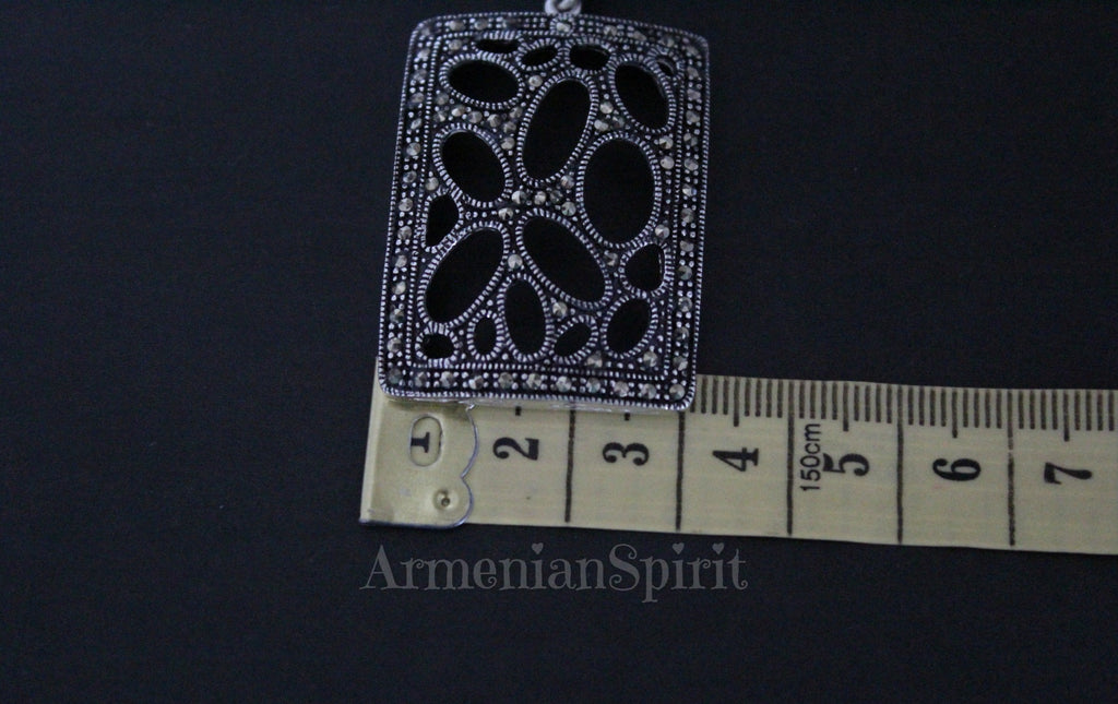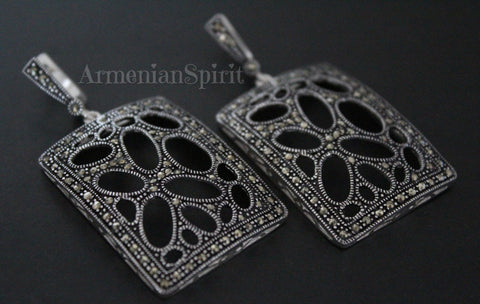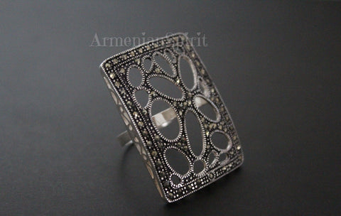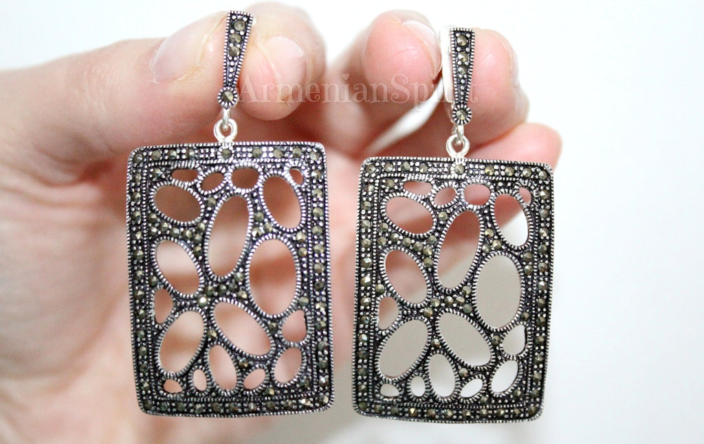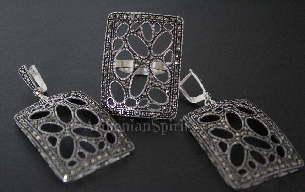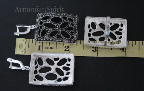 Enhance your jewelry collection with our luxurious 925 silver marcasite ring and earrings set. Guaranteed to impress, these pieces are perfect for any occasion and make a great gift for the special women in your life. Featuring stunning rectangle dangle earrings and a large rectangle ring, this set is perfect for making a statement. Each item is stamped with the highest quality 925 silver, ensuring long-lasting beauty.