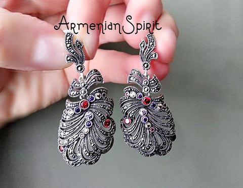 Add a touch of bohemian flair to your jewelry collection with our Silver 925 Feather Earrings. These very long earrings are adorned with a colorful mix of stones and marcasites, making them a unique and eye-catching piece. Perfect for the boho or Victorian jewelry lover, our earrings are the perfect addition to any outfit. Express your unique style with these sparkling earrings from our Mid Century collection on Armenian Spirit. Experience the convenience of shopping on Armenian Spirit with our buy feature, offering free worldwide shipping with tracking.