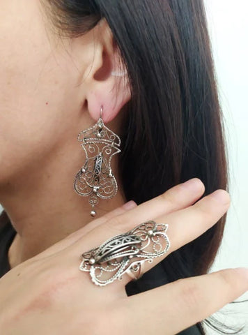 Introducing our Filigree Silver 925 SET earrings and ring, crafted by Armenian artisans with high-quality sterling silver. Expertly designed with traditional filigree techniques, this jewelry exudes elegance and makes for the perfect gift. Discover the spirit of Armenian craftsmanship with our artisan jewels.
