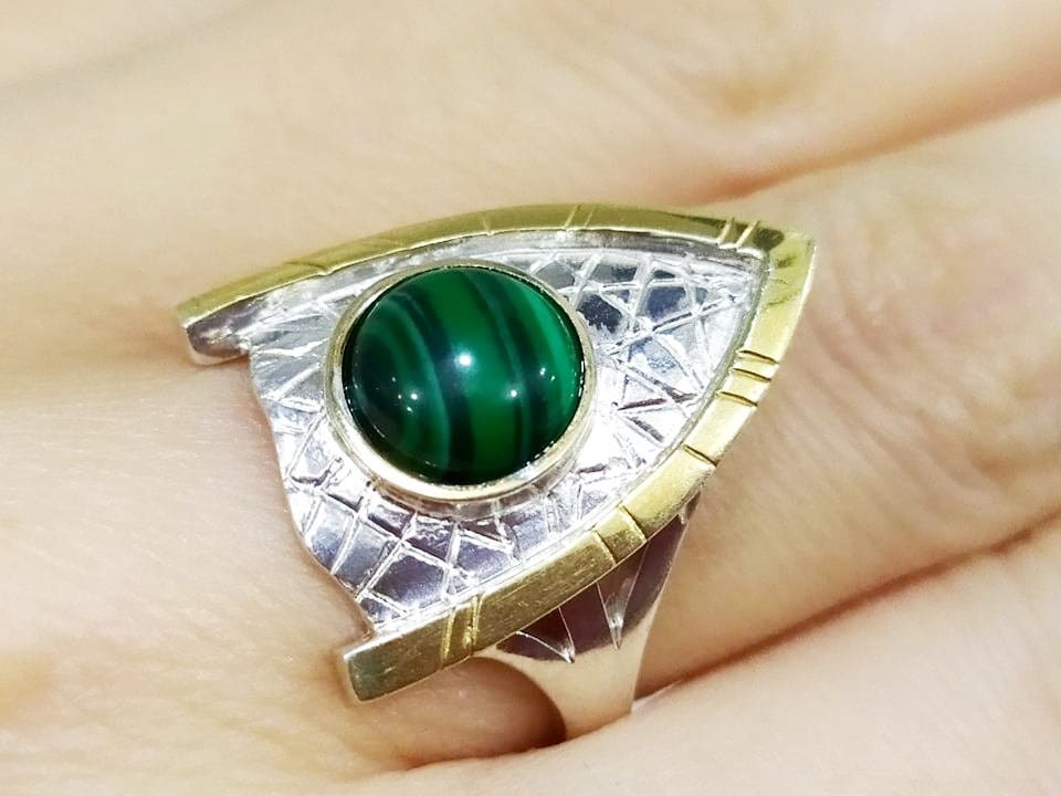 This gold plated silver 925 ring boasts a stunning Malachite natural cabochon gemstone, handcrafted with Armenian expertise. Its modern, contemporary design offers hypoallergenic and comfortable wear, ensuring both style and comfort in one beautiful piece. Upgrade your jewelry collection with our Armenian Spirit store's best pieces, featuring stunning silver and gold-plated designs.