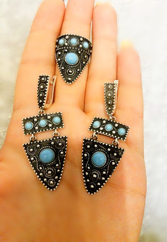 Elevate your style with our high-quality, handmade Gothic jewelry from our Etsy shop. Made with sterling silver925 and accented with lab turqoise and light blue stones, our Edwardian-inspired earrings are perfect for any Goth woman. Add a touch of elegance to your look with our unique, dotted design.