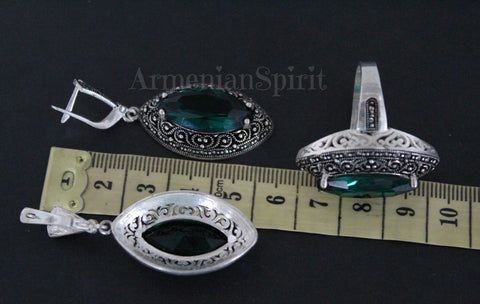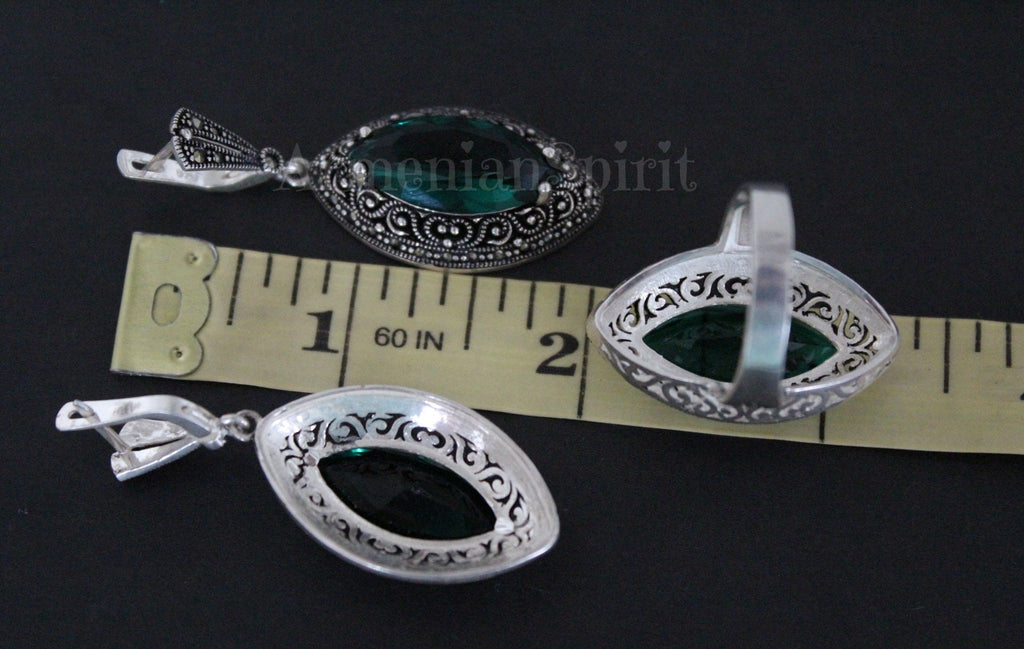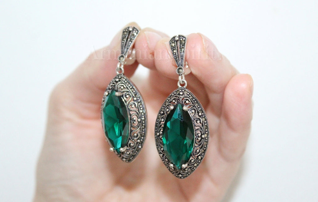 Elevate your style with these stunning Green Earrings from Armenian Spirit. Handmade with high-quality sterling silver and sparkling marcasite, these earrings add a touch of luxury to any outfit. Perfect for any occasion, they also make a thoughtful gift for loved ones. Complete your look with these beautiful emerald dress matching accessories. WE MAKE THESE EARRINGS IN ANY COLOR (stone): RED, BLUE, BLACK, BROWN, PINK, GREEN,etc