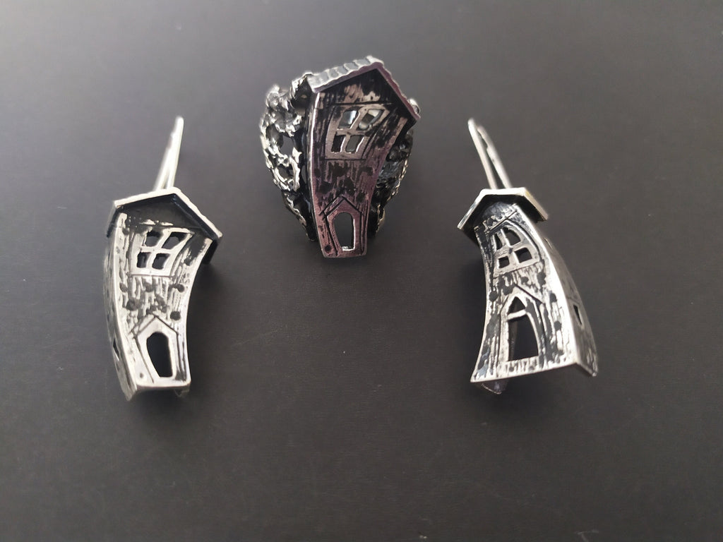 Do you like unusual silver jewelry? This blackened 925 sterling silver house ring and earrings will be a great find for you. The house jewelry is made in art style. This is a real work of art of Armenian jewelers. A beautiful fairy tale house with windows is a really rare piece of jewelry.