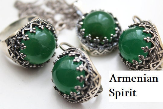 Experience the beauty of vintage Armenian jewelry with our Jade SET earrings, ring, and pendant. Made with high quality sterling silver 925, each piece features a stunning green gemstone and unique crown rim design. Elevate your style with this retro and timeless collection from our Etsy shop, Armenian Spirit. Find the perfect gift at our top-rated online store, Etsy Best Jewelry. With high-quality options, you'll get top-notch jewelry and excellent discounts. Plus, enjoy free shipping worldwide for an easy and convenient shopping experience. Trust us to be the best store for all your gift-giving needs.
